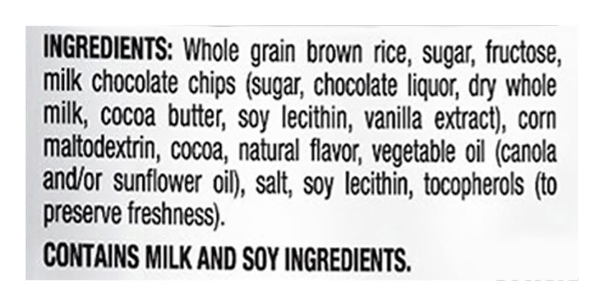Ingredients: Whole Grain Brown Rice, Sugar, Fructose, Milk Chocolate Chips (Sugar, Chocolate Liquor, Dry Whole Milk, Cocoa Butter, Soy Lecithin, Vanilla Extract), Corn Maltodextrin, Cocoa, Natural Flavor, Vegetable Oil (Canola and/or Sunflower Oil), Salt, Soy Lecithin, Tocopherols (to Preserve Freshness) Contains: Milk
