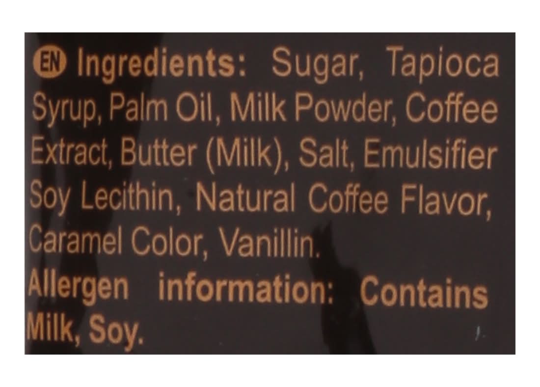 Ingredients: Sugar, Tapioca Syrup, Palm Oil, Milk Powder, Coffee Extract, Butter (Milk), Salt, Emulsifier Soy Lecithin, Natural Coffee Flavor, Caramel Color, Vanillin Contains: Milk, Soybeans