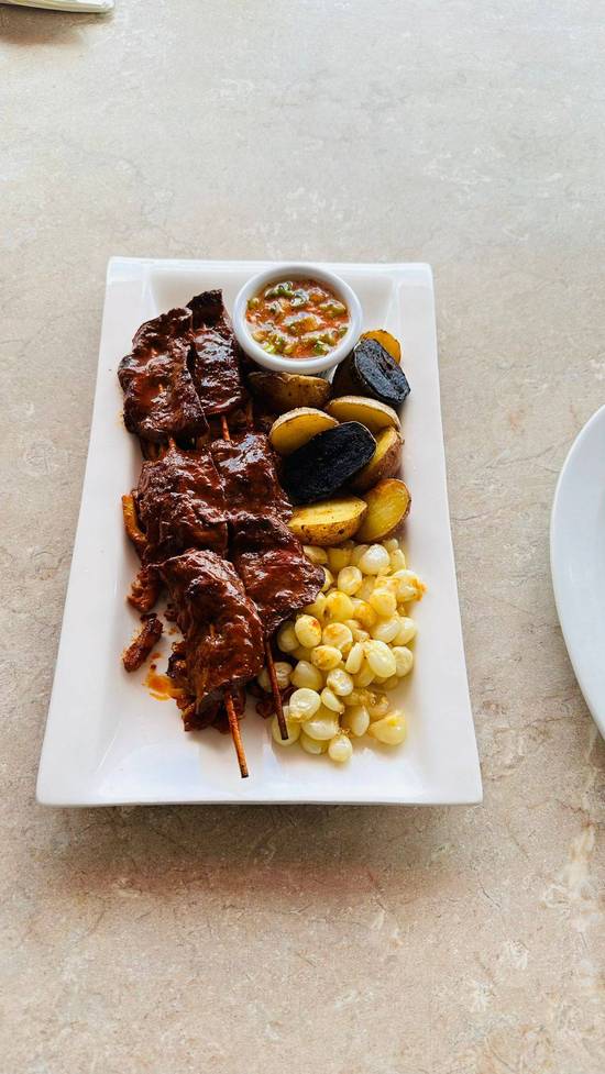 Heart anticuchos perfectly cooked on a smoked grill in a delicious anticuchera sauce, and rachi accompanied by native potatoes, slices of Peruvian corn, rocoto carretillero.