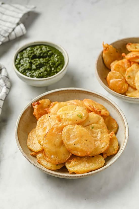 Aloo pakoda also known as potato pakoda and aloo Bhaji in the south, is Indian style potato fritter made with sliced potatoes, gram flour, and spices. Served with spicy, sweet, and tangy chutneys.