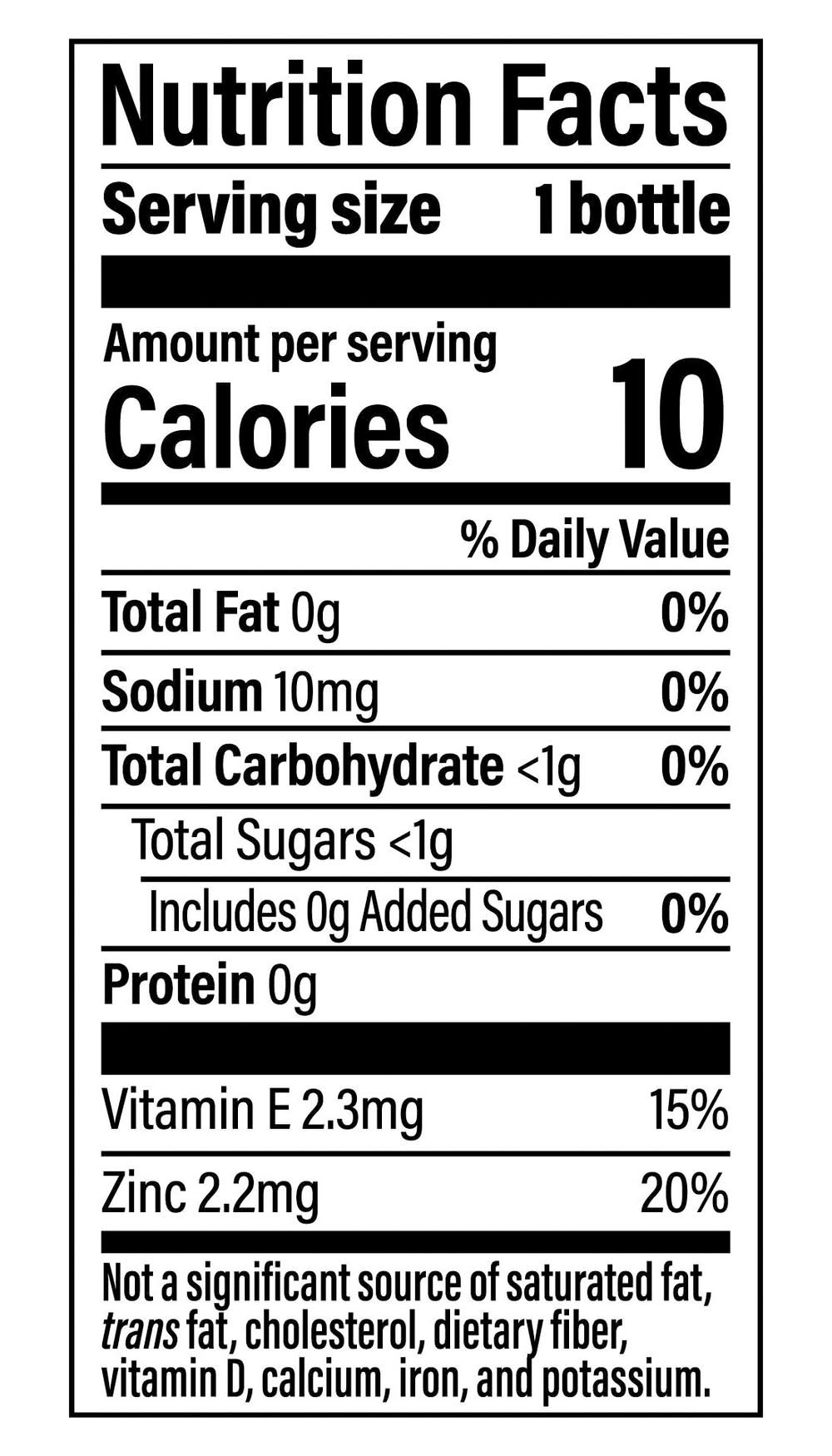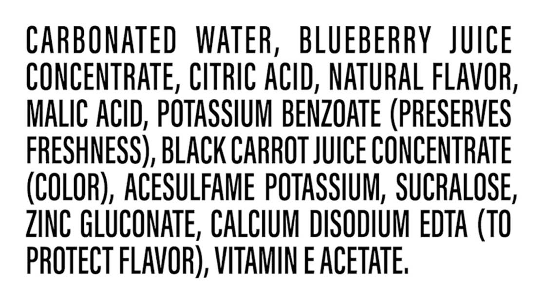 Ingredients: Carbonated Water, Blueberry Juice Concentrate, Citric Acid, Natural Flavor, Malic Acid, Potassium Benzoate (Preserves Freshness), Black Carrot Juice Concentrate (Color), Acesulfame Potassium, Sucralose, Zinc Gluconate, Calcium Disodium EDTA (to Protect Flavor), Vitamin E Acetate