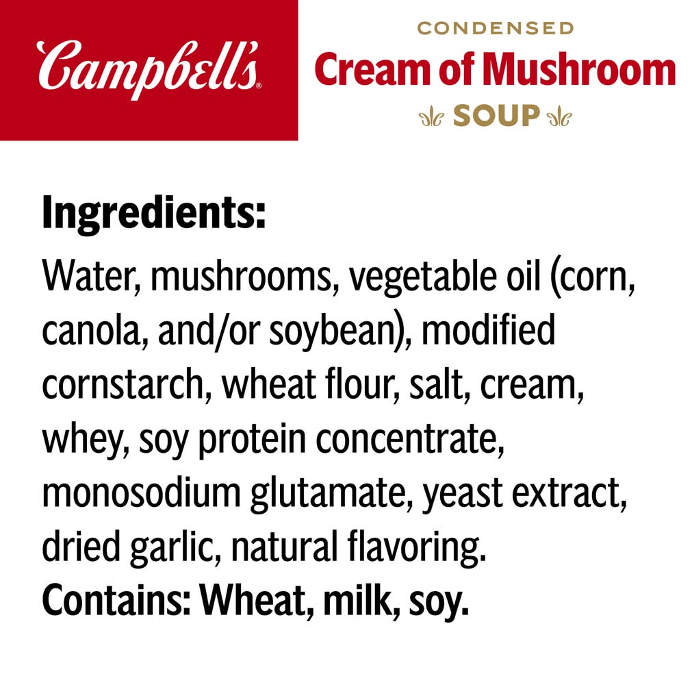 Creamy, comforting, and endlessly versatile, campbell’s cream of mushroom soup brings rich, savory flavors to every bite. Made with tender mushrooms and farm-fresh cream, its velvety texture creates a cozy experience that feels like a hug in a bowl. Crafted with no preservatives, it’s a vegetarian soup that’s as thoughtful as it is delicious—perfect for sharing moments of care with loved ones. This canned soup is more than what goes in a bowl; it’s a secret weapon for easy meals. Stir it into green bean casseroles for a creamy finish, create luscious sauces, or use it as a soup starter to elevate your weeknight dinners. From savory one-skillet meals to indulgent recipes that impress, it’s ready to inspire creativity with minimal effort. Heat it up for sipping soup comfort or transform it into something extraordinary cambell's creamy soups are adaptable and verstile. Stock up on campbell's canned soup for quick recipes for cozy dinners, or rainy-day pick-me-ups. Whether it’s a chilly afternoon or a moment to share, this soup makes every bite feel a little more fun and comforting. Campbell's soup is always ready to deliver satisfying warmth and rich flavor. From tomato soup to cream of chicken and everything in between, campbell's soup is always ready to deliver satisfying warmth and rich flavor. • Brand: Campbell's • Flavor: Cream of mushroom • vegetarian • Campbell Soup Company, Camden,NJ • Packaging: Reusable