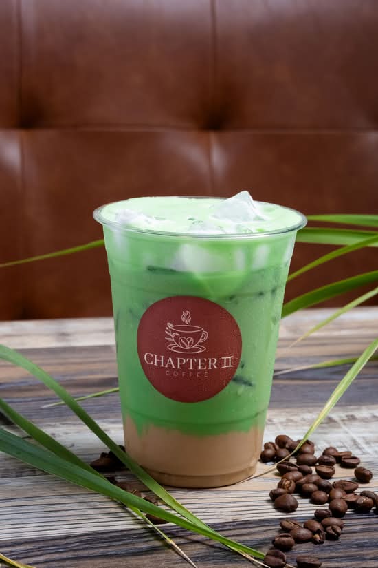 A creamy blend of pandan essence and coffee latte, topped with a layer of frothy milk.