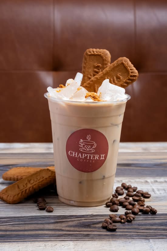 Smooth coffee latte blended with cookie butter, topped with crushed cookie pieces and garnished with whole cookies.