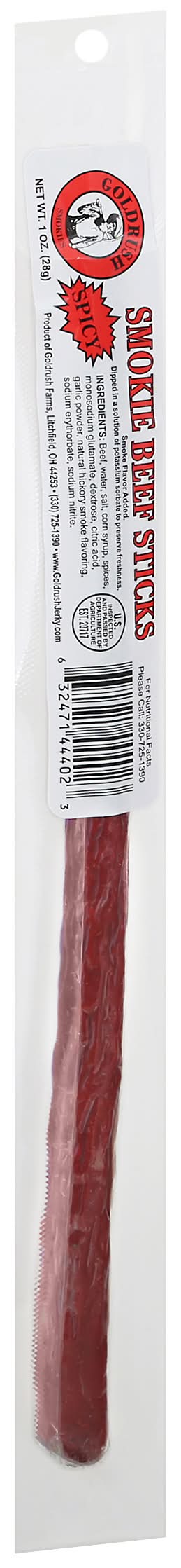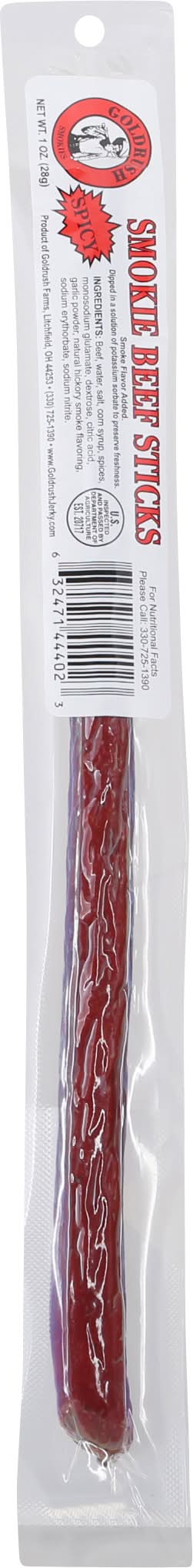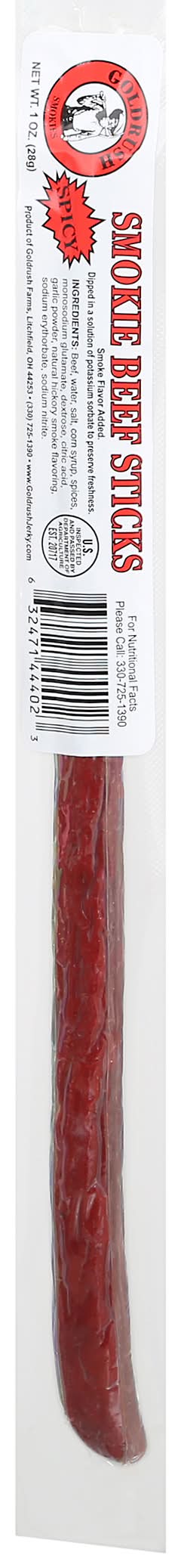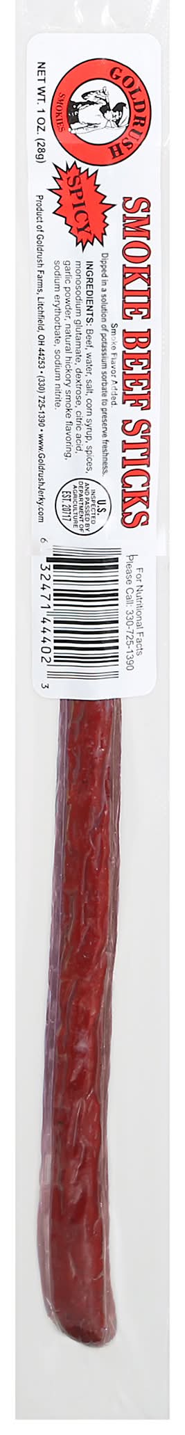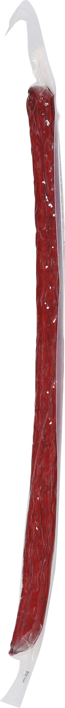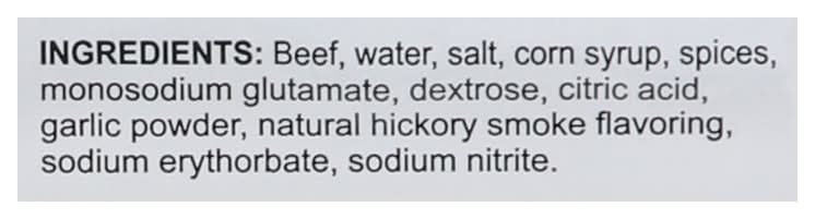 Ingredients: Beef, Water, Salt, Corn Syrup, Spices, Monosodium Glutamate, Dextrose, Citric Acid, Garlic Powder, Natural Hickory Smoke Flavoring, Sodium Erythorbate, Sodium Nitrite