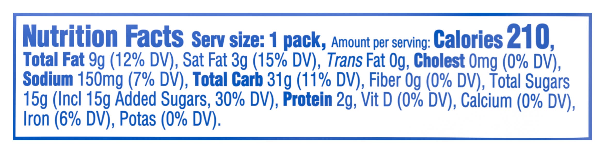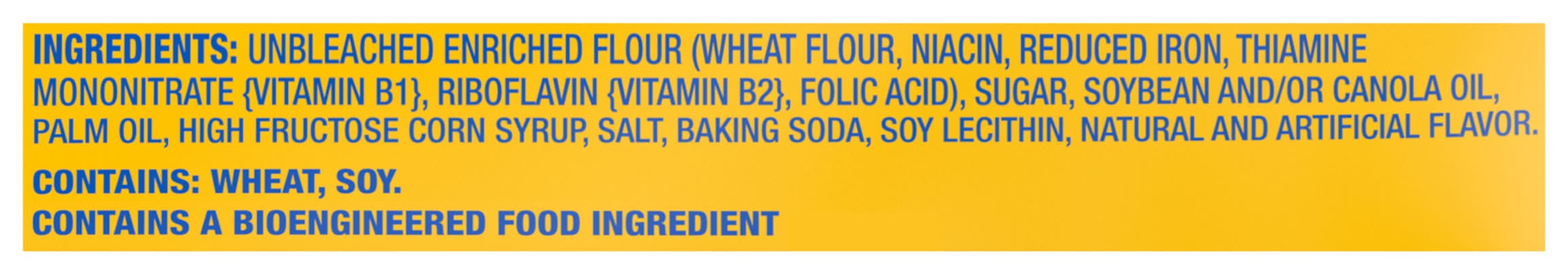 Ingredients: INGREDIENTS: UNBLEACHED ENRICHED FLOUR (WHEAT FLOUR, NIACIN, REDUCED IRON, THIAMINE MONONITRATE [VITAMIN B1], RIBOFLAVIN [VITAMIN B2], FOLIC ACID), SUGAR, SOYBEAN AND/OR CANOLA OIL, PALM OIL, HIGH FRUCTOSE CORN SYRUP, SALT, BAKING SODA, SOY LECITHIN, NATURAL AND ARTIFICIAL FLAVOR. CONTAINS: WHEAT, SOY. Contains: CONTAINS: WHEAT, SOY.