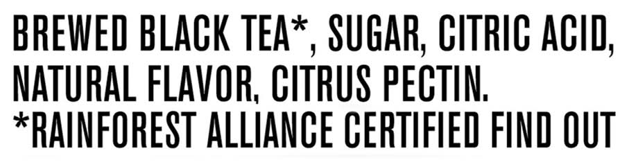 Ingredients: Brewed Black Tea (Rainforest Alliance Certified Find Out More at Ra.Org), Sugar, Citric Acid, Natural Flavor, Citrus Pectin