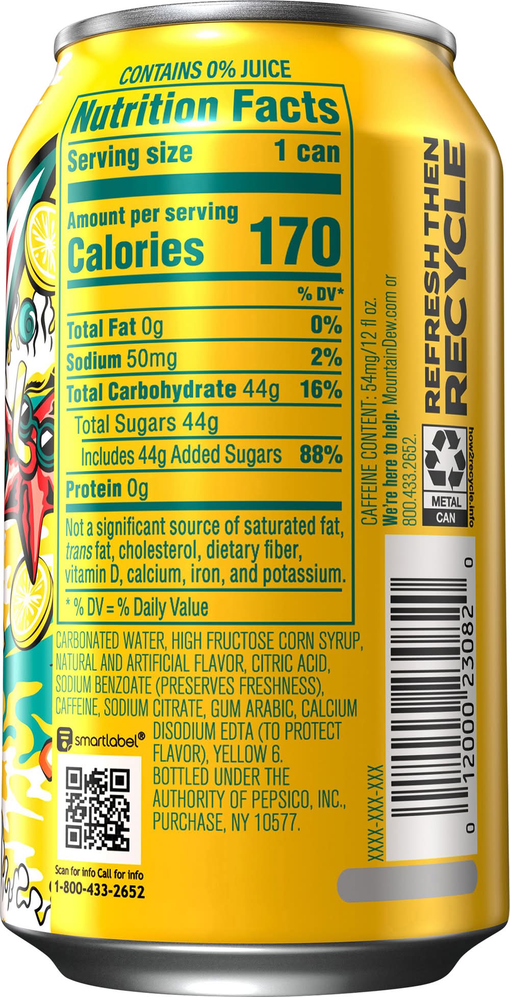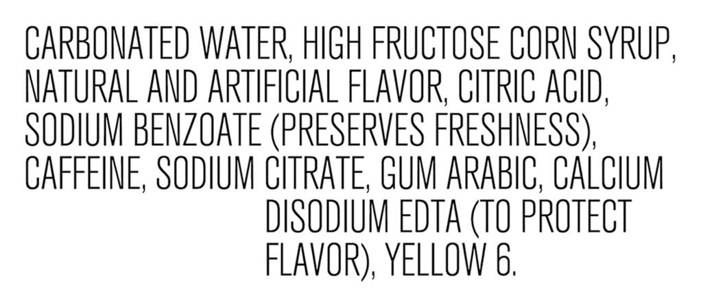 Ingredients: Carbonated Water, High Fructose Corn Syrup, Natural and Artificial Flavor, Citric Acid, Sodium Benzoate (Preserves Freshness), Caffeine, Sodium Citrate, Gum Arabic, Calcium Disodium EDTA (to Protect Flavor), Yellow 6 Contains: Corn