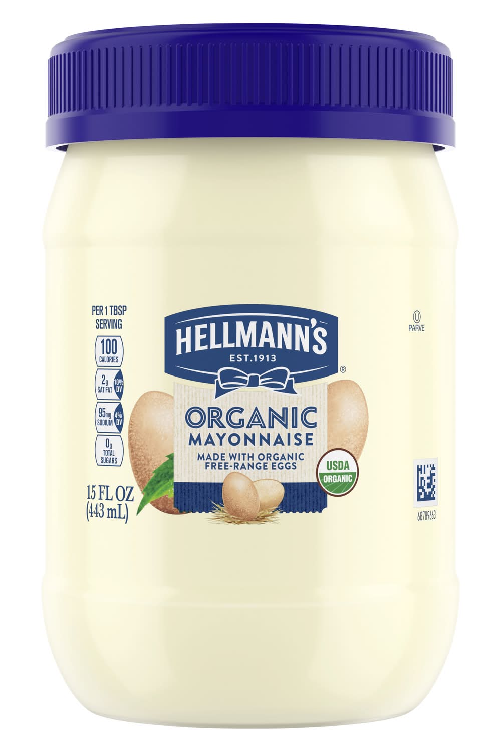 Hellmann's Organic Mayonnaise Original Mayo, 15 oz • Number of servings: 29 • Unilever, Englewood Cliffs, NJ, 07632 • Packaging: Reusable