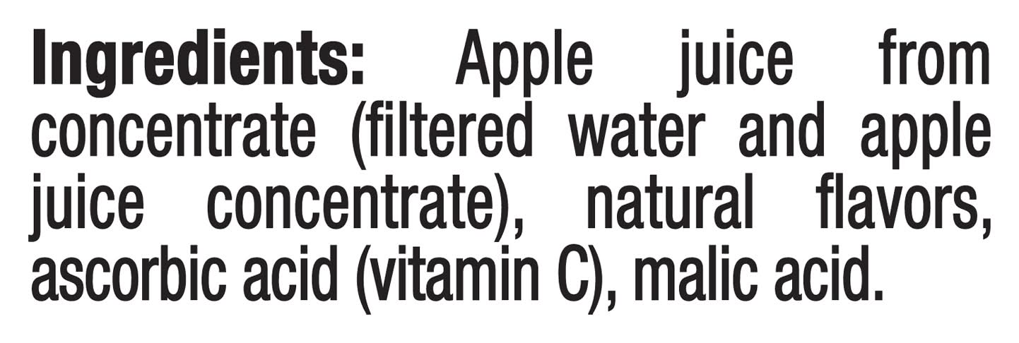 Ingredients: Apple Juice from Concentrate (Filtered Water and Apple Juice Concentrate), Natural Flavors, Ascorbic Acid (Vitamin C), Malic Acid