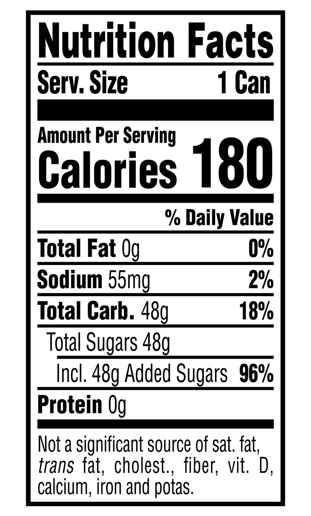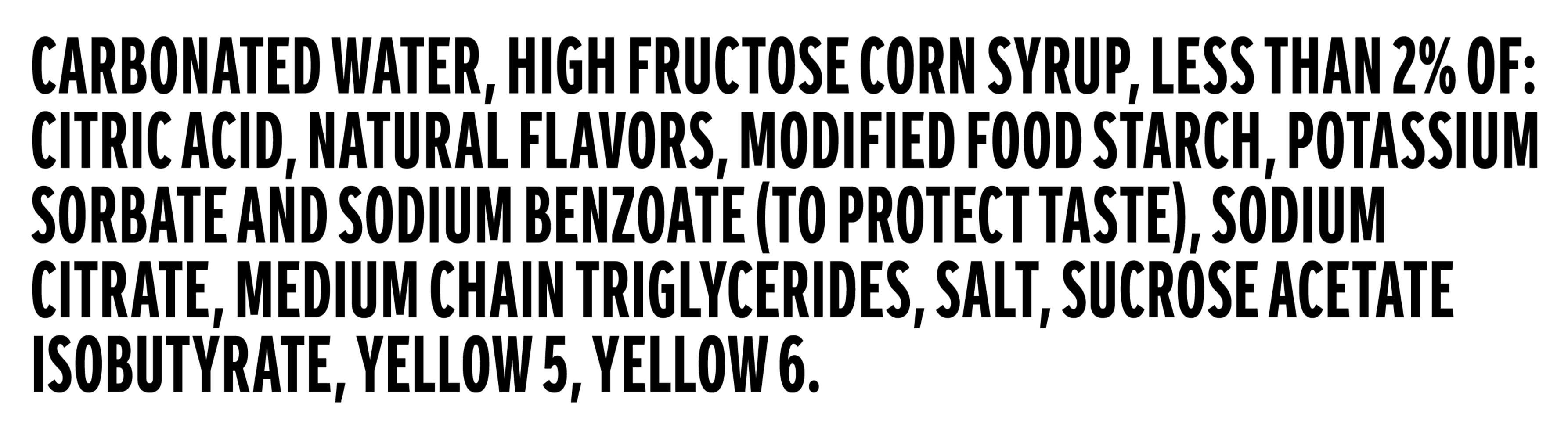 Ingredients: Carbonated Water, High Fructose Corn Syrup, Citric Acid, Natural Flavors, Modified Food Starch, Potassium Sorbate And Sodium Benzoate (To Protect Taste), Sodium Citrate, Medium Chain Triglycerides, Salt, Sucrose Acetate Isobutyrate, Yellow 5, Yellow 6.