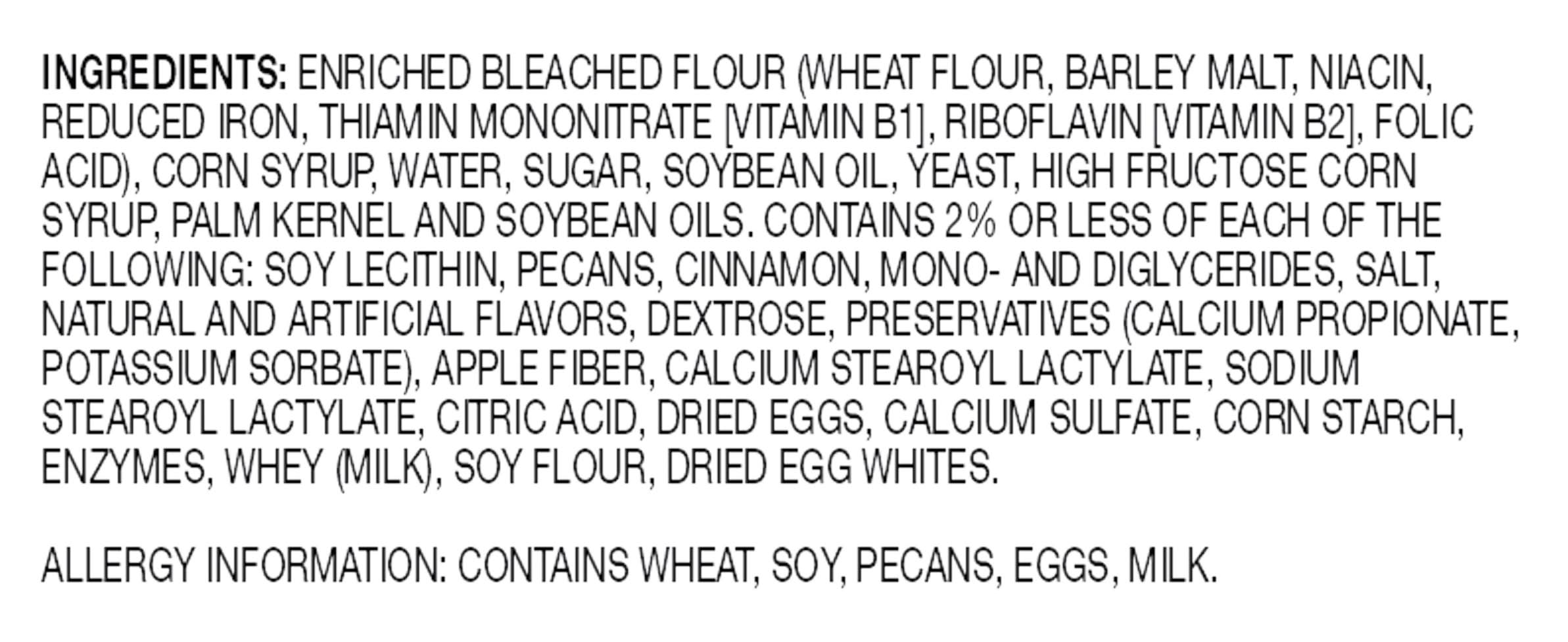 Ingredients: Enriched Bleached Flour (Wheat Flour, Barley Malt, Niacin, Reduced Iron, Thiamin Mononitrate [Vitamin B1], Riboflavin [Vitamin B2], Folic Acid), Corn Syrup, Water, Sugar, Soybean Oil, Yeast, High Fructose Corn Syrup, Palm Kernel and Soybean Oils, Contains 2% or Less of Each of the Following: Soy Lecithin, Pecans, Cinnamon, Mono- and Diglycerides, Salt, Natural and Artificial Flavors, Dextrose, Preservatives (Calcium Propionate, Potassium Sorbate), Apple Fiber, Calcium Stearoyl Lactylate, Sodium Stearoyl Lactylate, Citric Acid, Dried Eggs, Calcium Sulfate, Corn Starch, Enzymes, Whey (Milk), Soy Flour, Dried Egg Whites Contains: Wheat, Barley, Corn, Soybeans, Tree Nuts, Pecans, Eggs, Milk