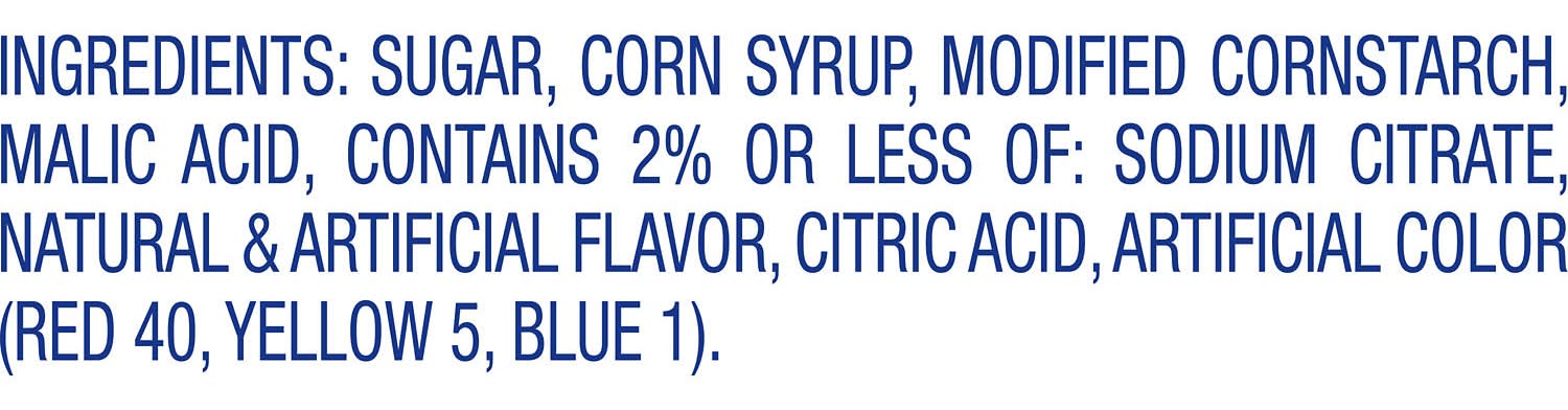 Ingredients: SUGAR, CORN SYRUP, MODIFIED CORNSTARCH, MALIC ACID, CONTAINS 2% OR LESS OF: SODIUM CITRATE, NATURAL ARTIFICIAL FLAVOR, CITRIC ACID, ARTIFICIAL COLOR (RED 40, YELLOW 5, BLUE 1), . Contains: Contains: Does Not Contain Any Of The 8 Major Allergens