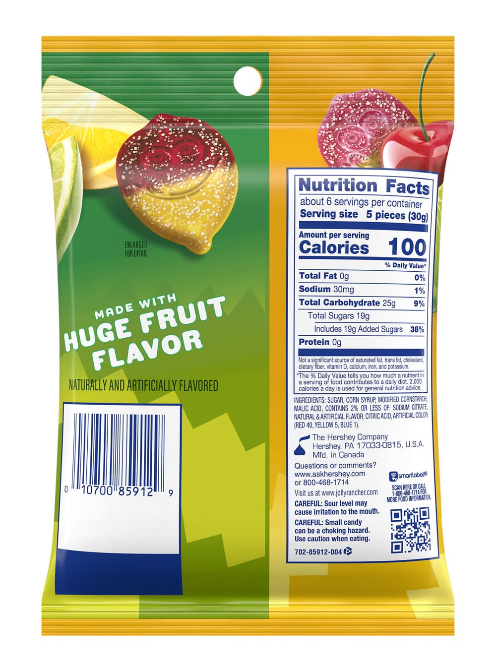 A mix of three fruity matchups for the whole family in just one bag of You wouldn't have thought it possible if you didn't know gummies candy. This bag of sour lemonade flavored gummies is full of fun, flavorful lemon shaped treats that each member of the family will be happy to choose from. Featuring fruity flavor combinations like sour cherry lemonade, sour lime lemonade and sour strawberry lemonade, these JOLLY RANCHER 2-in-1 gummies offer a perfect blend of sweet and sour tastes you're sure to love. Keep this bag with you on the go so you can share with friends, co-workers and family members throughout the day — but don't forget to save a few gummies for yourself during all of that sharing! These fruit flavored candies make the perfect candy bowl display all year thanks to vibrant colors and unique, attractive lemon gummy shapes. They're also great treats for Christmas, Easter, Valentine's Day and Halloween party favors. If you want a small candy with a big taste to keep your taste buds busy during movie nights, lunch hours and snack breaks, Sour Lemonade 2-in-1 chewy gummies are the treat for you Flavor: Cherry-lime-strawberry lemonade