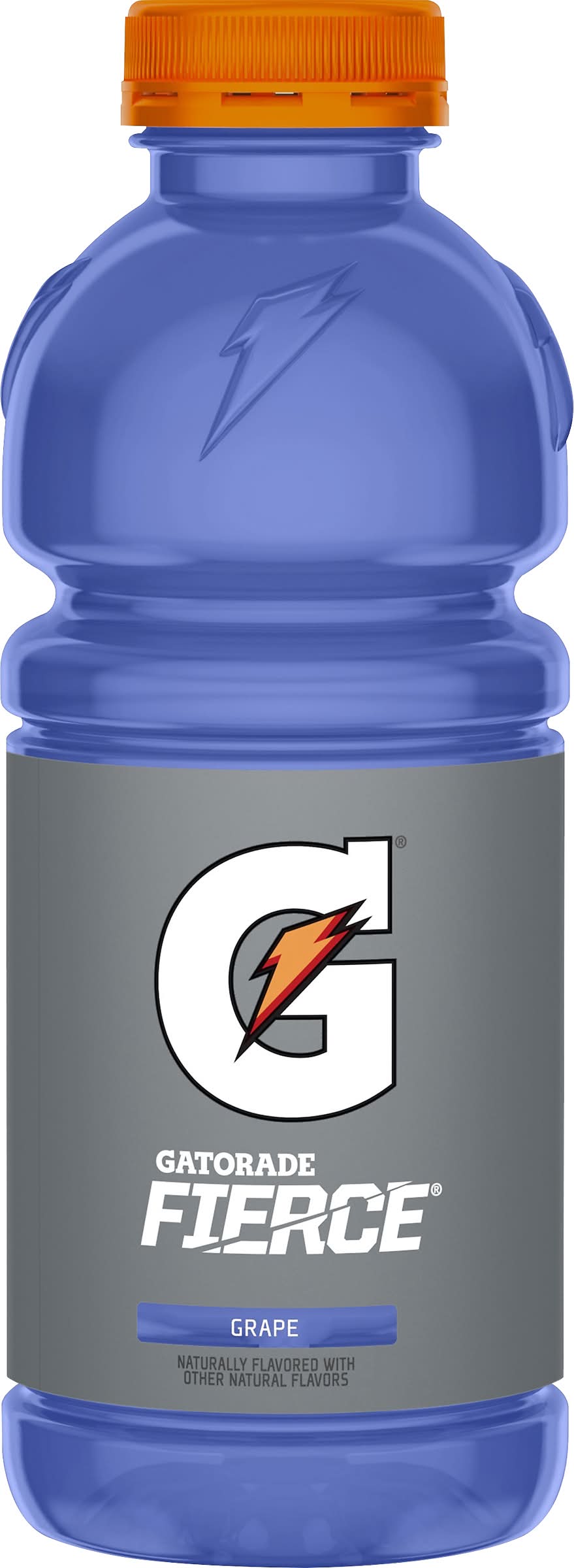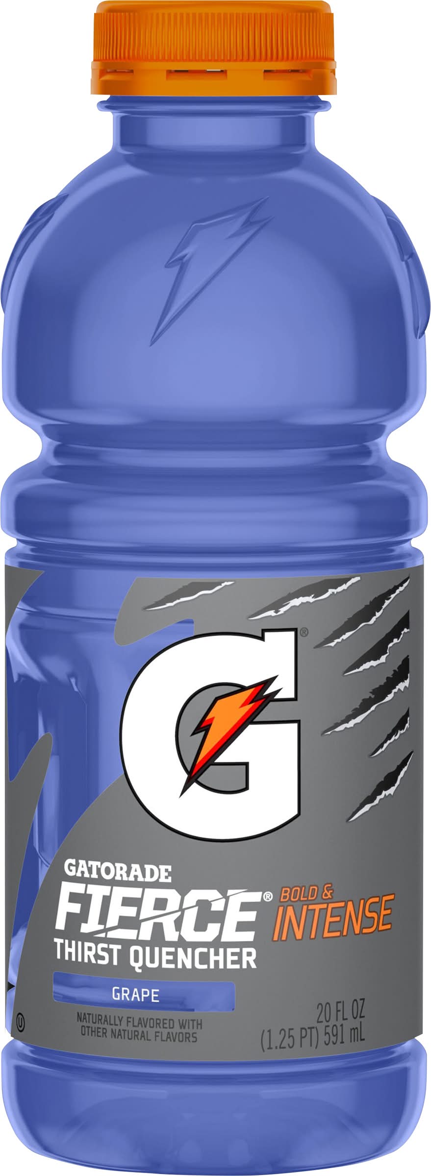 With a legacy over 40 years in the making, it's the most scientifically researched and game-tested way to replace electrolytes lost in sweat. Gatorade Fierce has a bold, intense flavor that replenishes better than water, which is why it's trusted by some of the world's best athletes. • Flavor: Grape • The Gatorade Co., P.O. Box 049003, Chicago, IL, 60604