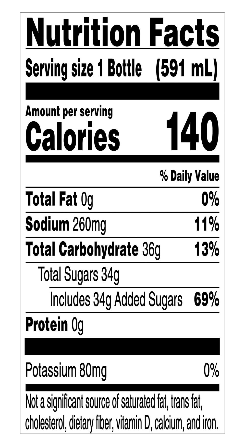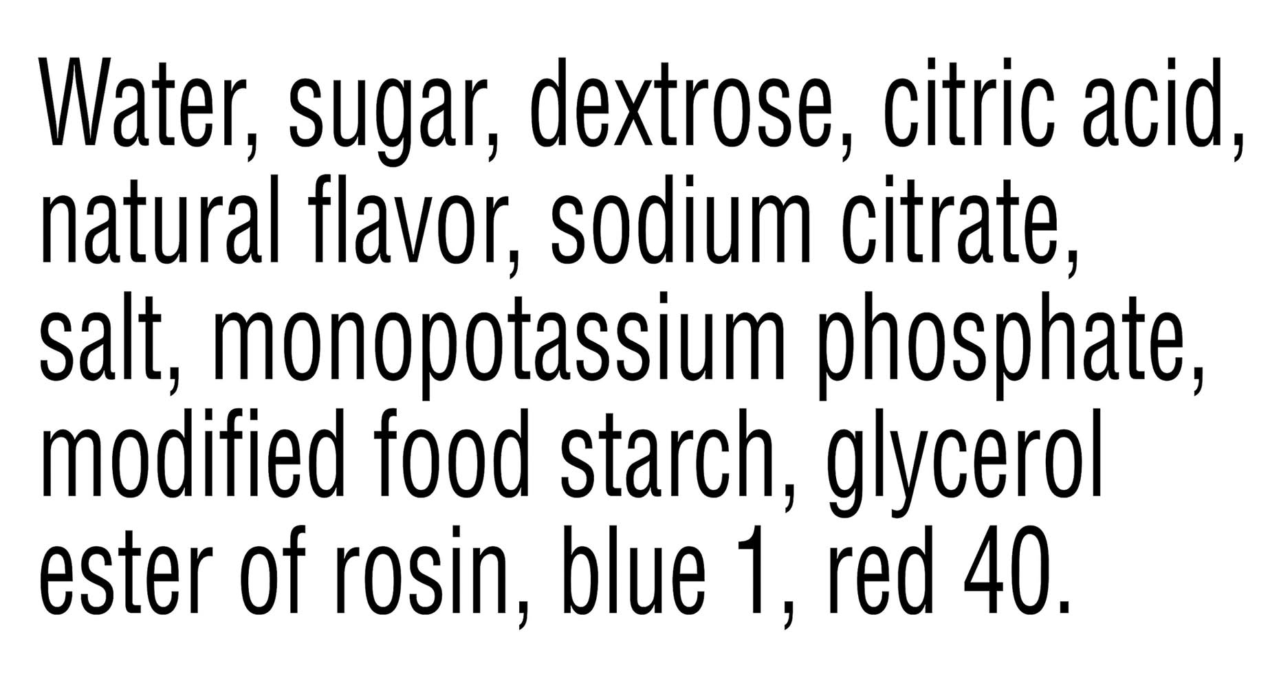Ingredients: Water, Dextrose, Citric Acid, Natural Flavor, Sodium Citrate, Salt, Monopotassium Phosphate, Modified Food Starch, Glycerol Ester of Rosin, Blue 1, Red 40.