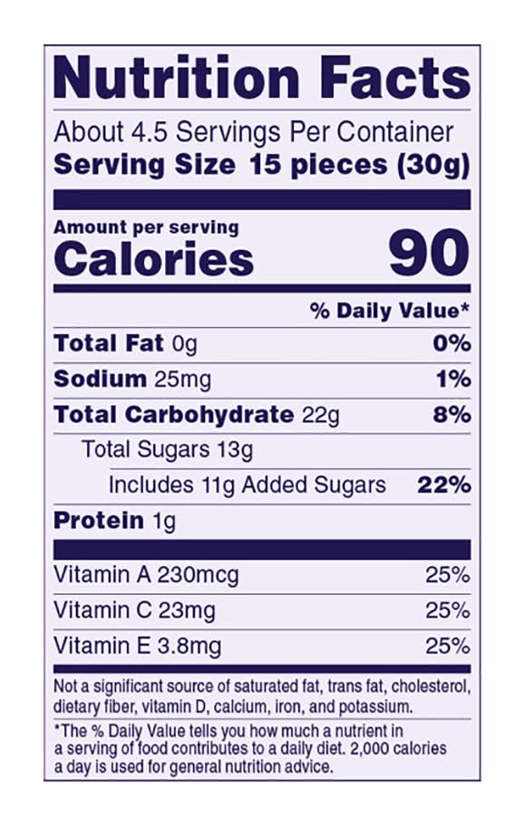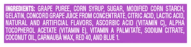 Ingredients: Grape Puree, Corn Syrup, Sugar, Modified Corn Starch, Gelatin, Concord Grape Juice from Concentrate, Citric Acid, Lactic Acid, Natural and Artificial Flavors, Ascorbic Acid (Vitamin C), Alpha Tocopherol Acetate (Vitamin E), Vitamin A Palmitate, Sodium Citrate, Coconut Oil, Carnauba Wax, Red 40, and Blue 1 Contains: Corn, Tree Nuts, Coconuts