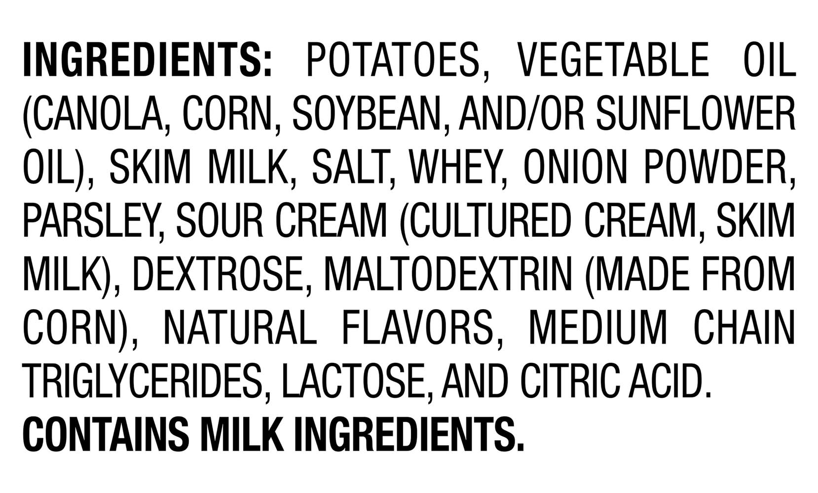 Ingredients: Potatoes, Vegetable Oil (Canola, Corn, Soybean, and/or Sunflower Oil), Skim Milk, Salt, Whey, Onion Powder, Parsley, Sour Cream (Cultured Cream, Skim Milk), Dextrose, Maltodextrin (Made from Corn), Natural Flavors, Medium Chain Triglycerides, Lactose, and Citric Acid Contains: Milk, Corn, Soybeans, Lactose