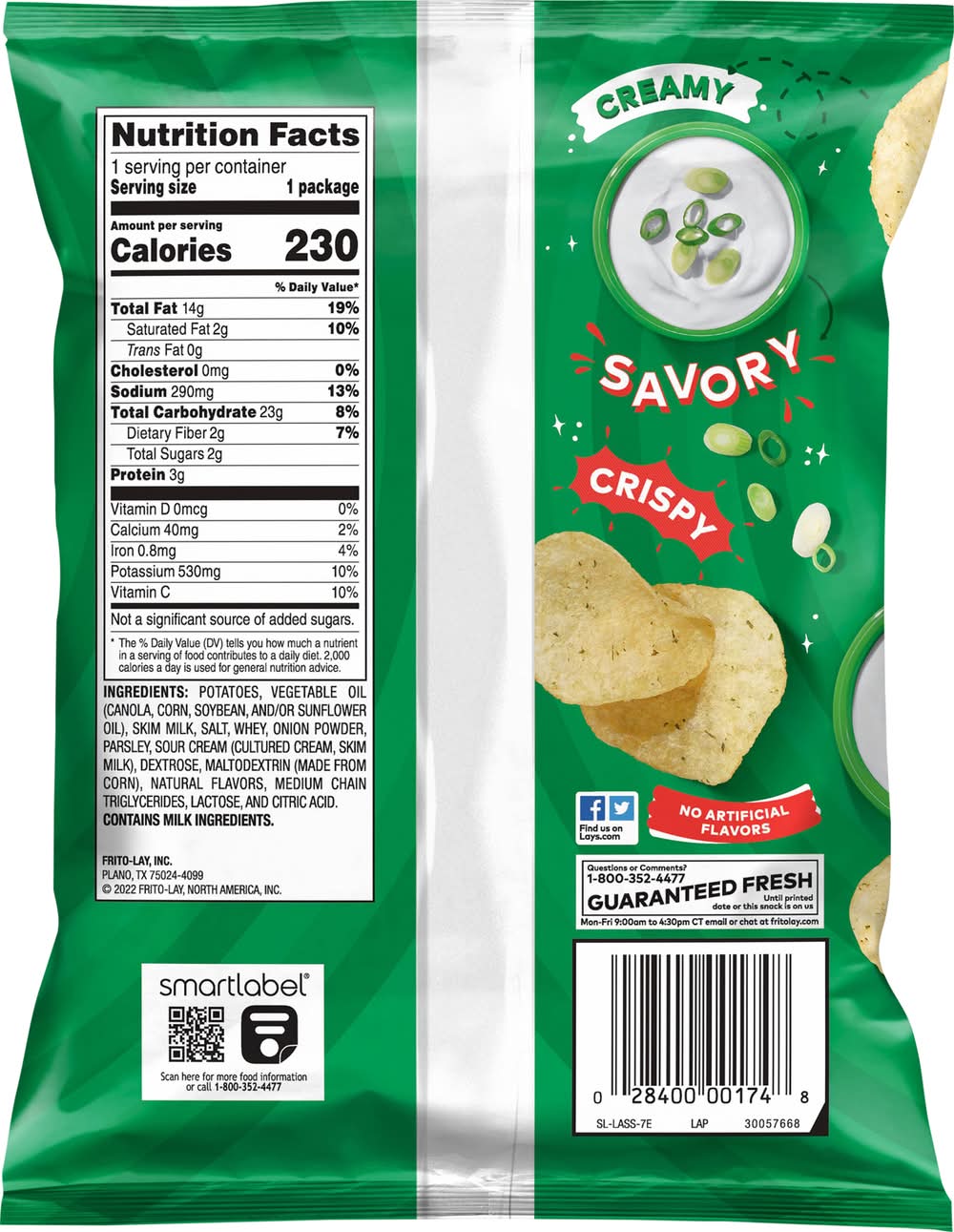 230 calories per pkg. See nutrition information for total fat content. Creamy. Savory. Crispy. Guaranteed fresh until printed date or this snack is on us. • Flavor: Sour cream & onion • Number of servings: 1