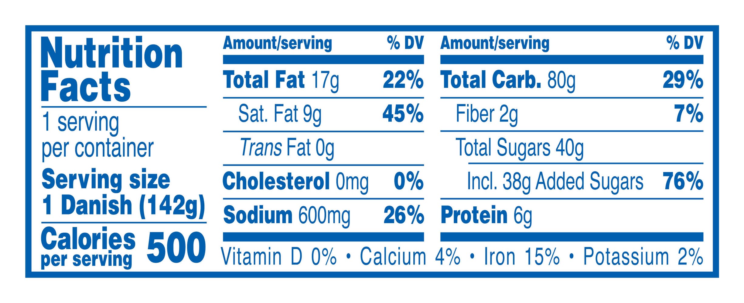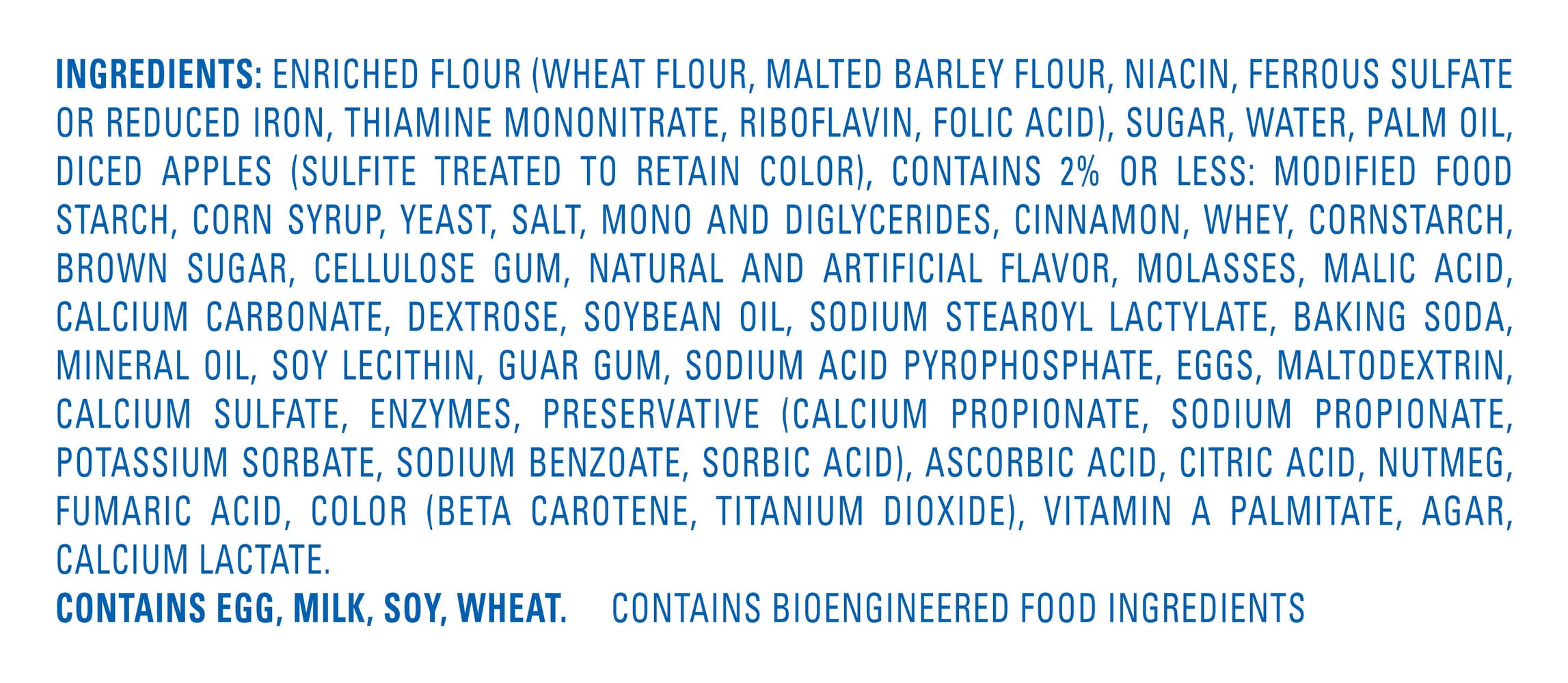 Ingredients: Enriched Flour (Wheat Flour, Malted Barley Flour, Niacin, Ferrous Sulfate Or Reduced Iron, Thiamine Mononitrate, Riboflavin, Folic Acid), Sugar, Water, Palm Oil, Diced Apples (Sulfite Treated To Retain Color), Contains 2% Or Less: Modified Food Starch, Corn Syrup, Yeast, Salt, Mono And Diglycerides, Cinnamon, Whey, Cornstarch, Brown Sugar, Cellulose Gum, Natural And Artificial Flavor, Molasses, Malic Acid, Calcium Carbonate, Dextrose, Soybean Oil, Sodium Stearoyl Lactylate, Baking Soda, Mineral Oil, Soy Lecithin, Guar Gum, Sodium Acid Pyrophosphate, Eggs, Maltodextrin, Calcium Sulfate, Enzymes, Preservative (Calcium Propionate, Sodium Propionate, Potassium Sorbate, Sodium Benzoate, Sorbic Acid), Ascorbic Acid, Citric Acid, Nutmeg, Fumaric Acid, Color (Beta Carotene, Titanium Dioxide), Vitamin A Palmitate, Agar, Calcium Lactate. Contains Egg, Milk, Soy, Wheat. Contains Bioengineered Food Ingredients Contains: Contains Egg, Milk, Soy, Wheat. Contains Bioengineered Food Ingredients.