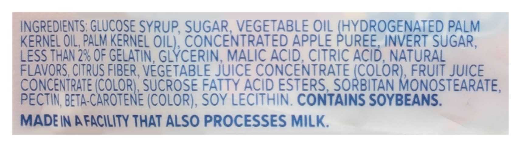 Ingredients: Glucose Syrup, Sugar, Vegetable Oil (Hydrogenated Palm Kernel Oil, Palm Kernel Oil), Concentrated Apple Puree, Invert Sugar, Less than 2% of Gelatin, Glycerin, Malic Acid, Citric Acid, Natural Flavors, Citrus Fiber, Vegetable Juice Concentrate (Color), Fruit Juice Concentrate (Color), Sucrose Fatty Acid Esters, Sorbitan Monostearate, Pectin, Beta-Carotene (Color), Soy Lecithin Contains: Soybeans, Milk
