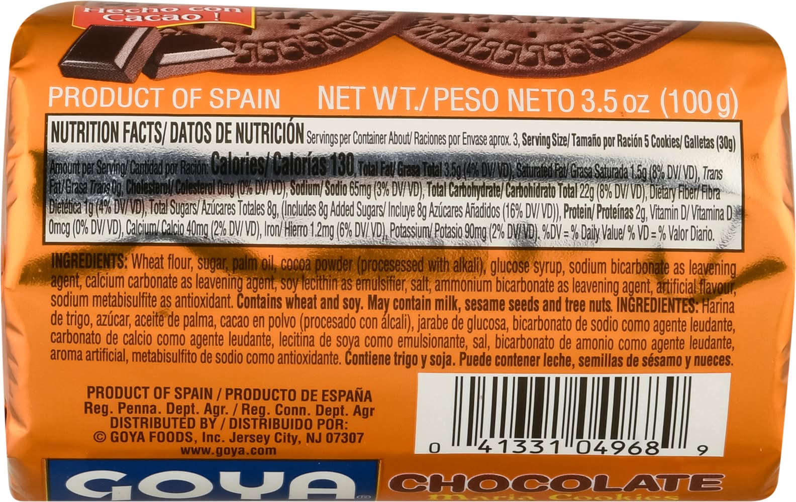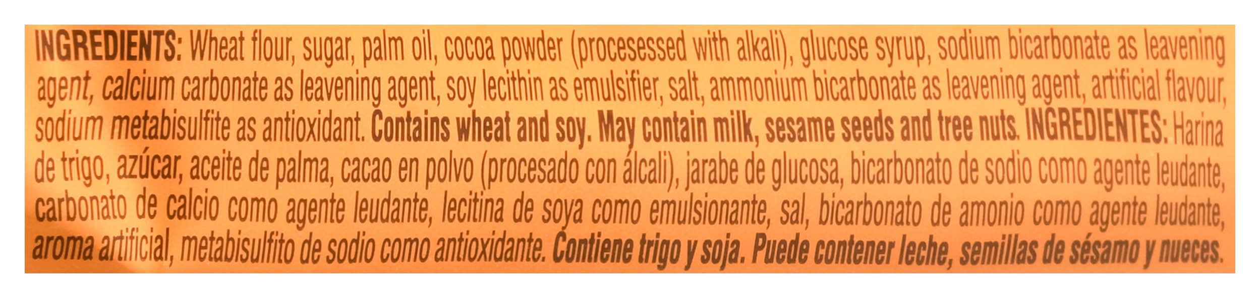 Ingredients: WHEAT FLOUR, SUGAR, PALM OIL, COCOA POWDER, GLUCOSE SYRUP, SODIUM BICARBONATE AS LEAVENING AGENT, CALCIUM CARBONATE AS LEAVENING AGENT, SOY LECITHIN AS EMULSIFIER, SALT, AMMONIUM BICARBONATE AS LEAVENING AGENT, ARTIFICIAL FLAVOR, SODIUM METABISULATE AS AVIOXIDANT. Contains: Wheat, Soybeans, Sulfites, Milk, Sesame, Tree Nuts