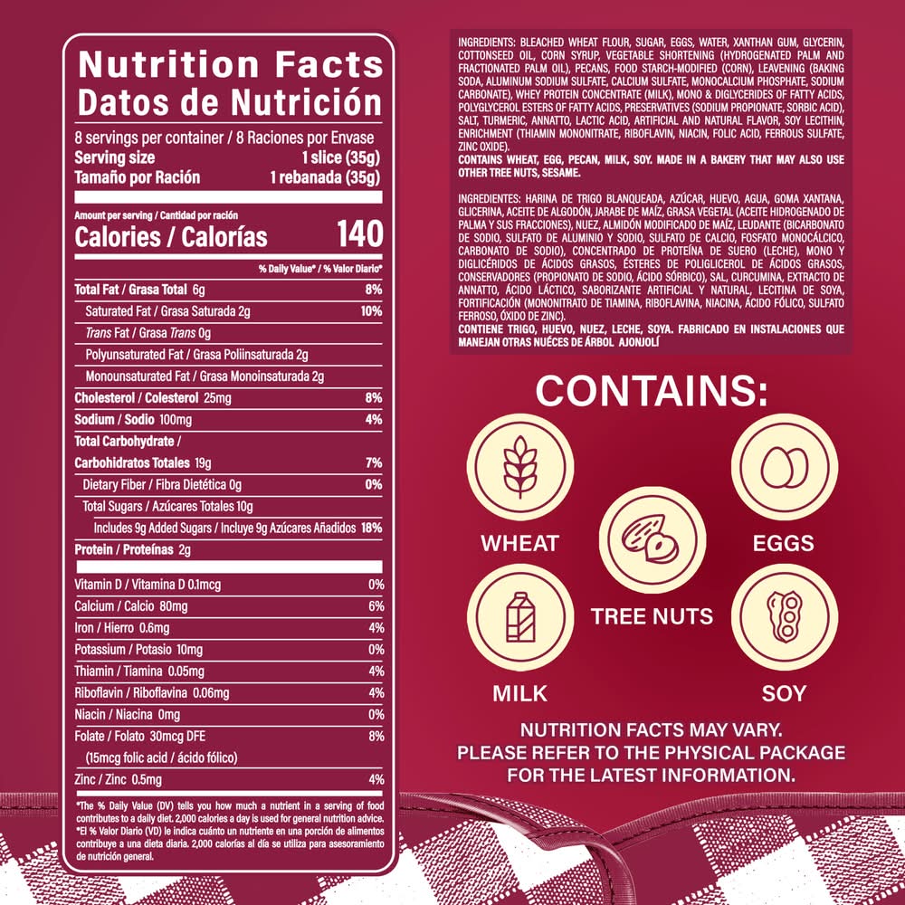 Ingredients: WHEAT FLOUR, EGGS, SUGAR, WATER, VEGETABLE OIL (SOYBEAN), GLYCERIN, CORN SYRUP, PECANS, VEGETABLE SHORTENING [HYDROGENATED PALM AND FRACTIONATED PALM OIL], FOOD STARCH-MODIFIED (CORN), LEAVENING [BAKING SODA, ALUMINUM SODIUM SULFATE, CALCIUM SULFATE, MONOCALCIUM PHOSPHATE, SODIUM CARBONATE], PRESERVATIVES [SODIUM PROPIONATE, SORBIC ACID], XANTHAN GUM, MONO DIGLYCERIDES, SALT, NATURAL FLAVOR, TURMERIC, ANNATTO, CARNAUBA WAX, POLYGLYCEROL ESTERS OF FATTY ACIDS, SOY LECITHIN, ENRICHMENT [THIAMIN MONONITRATE, RIBOFLAVIN, NIACIN, FOLIC ACID, FERROUS SULFATE, ZINC OXIDE], . Contains: CONTAINS EGG, PECAN, SOY, WHEAT.