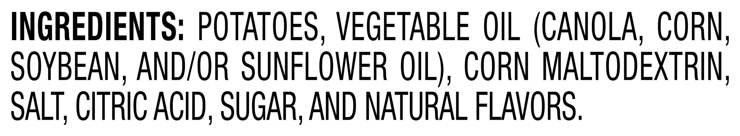 Ingredients: Potatoes, Vegetable Oil (Canola, Corn, Soybean, and/or Sunflower Oil), Corn Maltodextrin, Salt, Citric Acid, Sugar, and Natural Flavors Contains: Soybeans