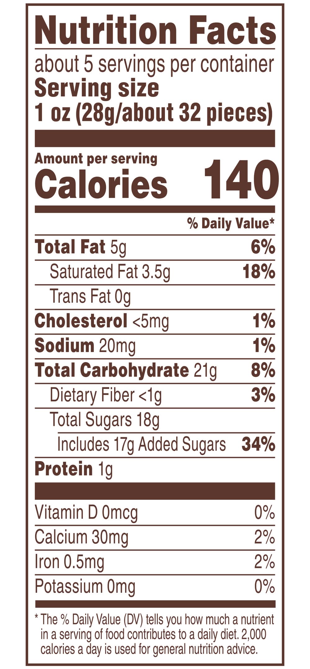 Ingredients: MILK CHOCOLATE (SUGAR, CHOCOLATE, SKIM MILK, COCOA BUTTER, LACTOSE, MILKFAT, SOY LECITHIN, SALT, NATURAL FLAVOR), SUGAR, CORNSTARCH; LESS THAN 1% OF: CORN SYRUP, DEXTRIN, COLORS (INCLUDES BLUE 1 LAKE, YELLOW 6, RED 40, YELLOW 5, BLUE 1, YELLOW 6 LAKE, RED 40 LAKE, YELLOW 5 LAKE, BLUE 2 LAKE, BLUE 2), CARNAUBA WAX, GUM ACACIA. Contains: CONTAINS MILK AND SOY.\nMAY CONTAIN PEANUTS.