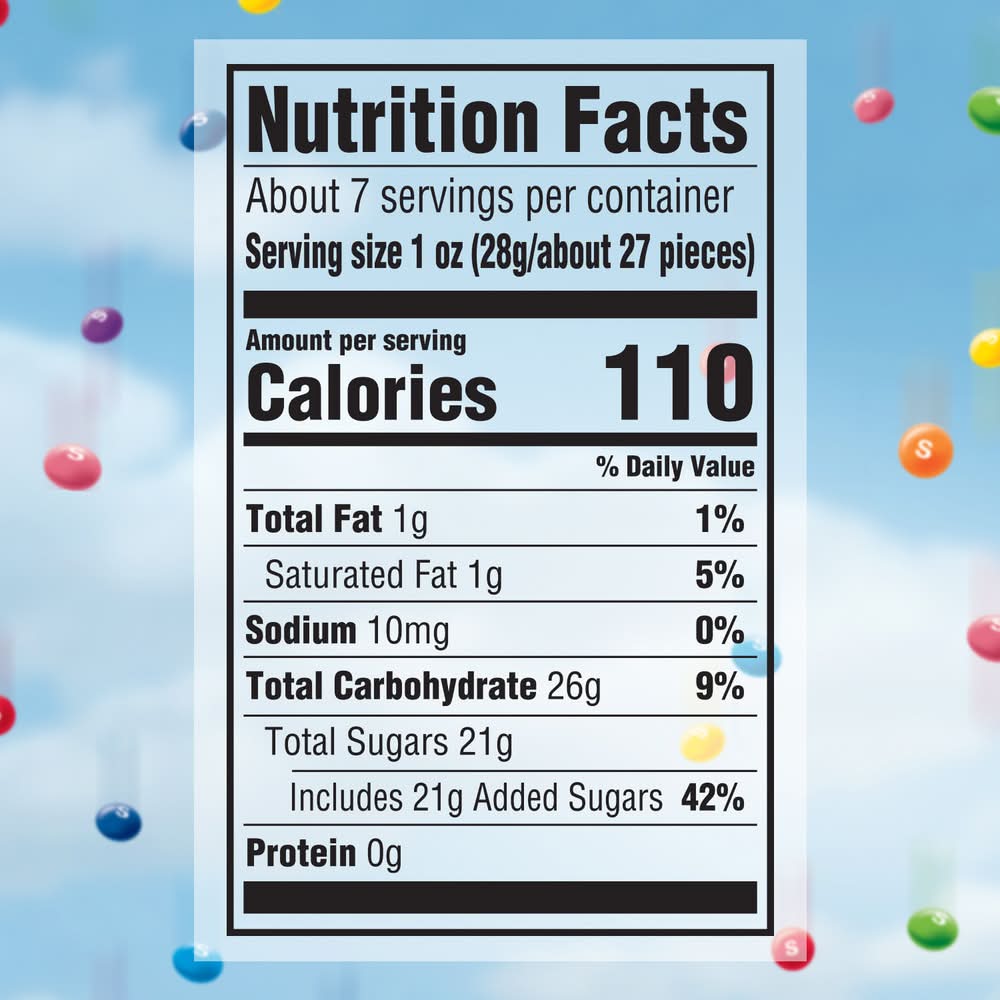 Ingredients: Sugar, Corn Syrup, Hydrogenated Palm Kernel Oil; Less than 2% of: Citric Acid, Tapioca Dextrin, Modified Corn Starch, Natural and Artificial Flavors, Sodium Citrate, Colors (Yellow 5 Lake, Red 40 Lake, Blue 2 Lake, Blue 1 Lake, Yellow 6 Lake, Titanium Dioxide, Blue 1, Yellow 6, Red 40, Yellow 5), Carnauba Wax