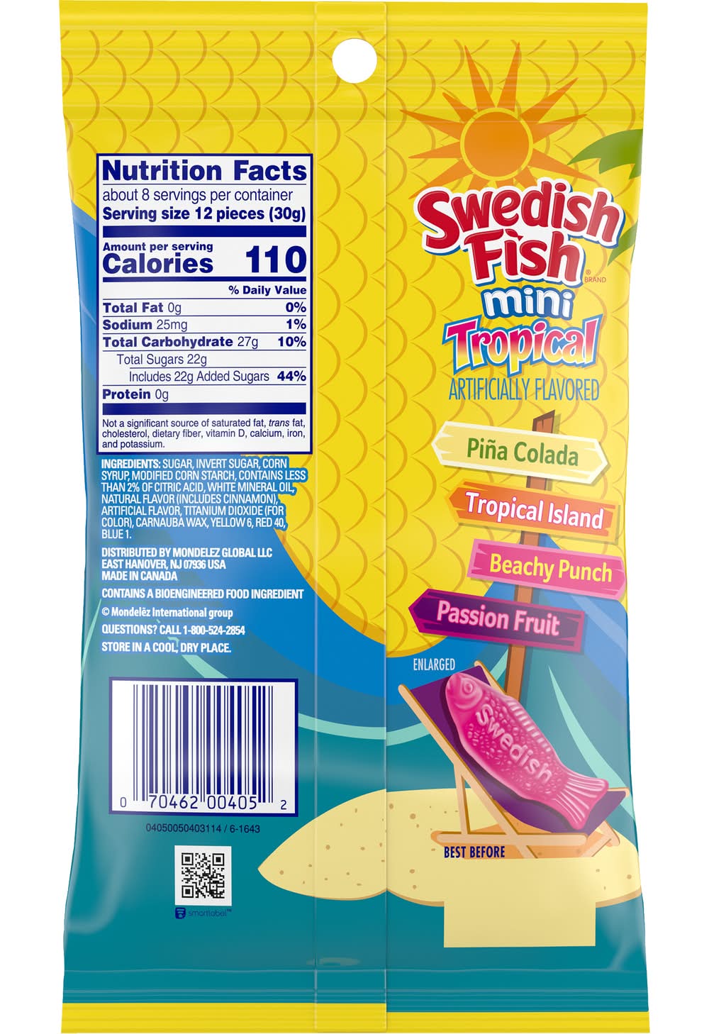 SWEDISH FISH Mini Tropical Soft & Chewy Candy brings the flavor of the islands to your taste buds. A fun twist on the traditional SWEDISH FISH red candy, this tropical candy features four unique flavors, including pina colada, tropical island, beachy punch and passion fruit. The mini fish shapes come in fun colors that add excitement to your candy experience, no matter what the occasion. Keep SWEDISH FISH candy on-hand for quick snacks or as party favors for holidays or birthdays. This soft candy also makes a tasty movie theater candy to snack on during your favorite flick and a flavor-filled Halloween candy for trick-or-treaters. Each package of bagged candy is the perfect size for stashing in purses, backpacks and lunchboxes for gummy snacks on-the-go. Stay stocked with bulk candy so you're always ready with a sweet treat. Flavor: Tropical