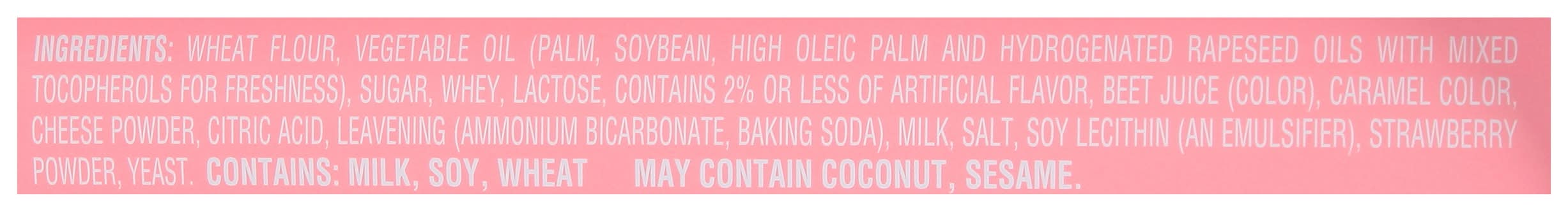 Ingredients: Wheat Flour, Vegetable Oil (Palm, Soybean, High Oleic Palm and Hydrogenated Rapeseed Oils with Mixed Tocopherols for Freshness), Sugar, Whey, Lactose, Contains 2% or Less of Artificial Flavor, Beet Juice (Color), Caramel Color, Cheese Powder Citric Acid, Leavening (Ammonium Bicarbonate, Baking Soda), Milk, Salt, Soy Lecithin (an Emulsifier), Strawberry Powder, Yeast Contains: Wheat, Soybeans, Lactose, Milk, Tree Nuts, Coconuts, Sesame