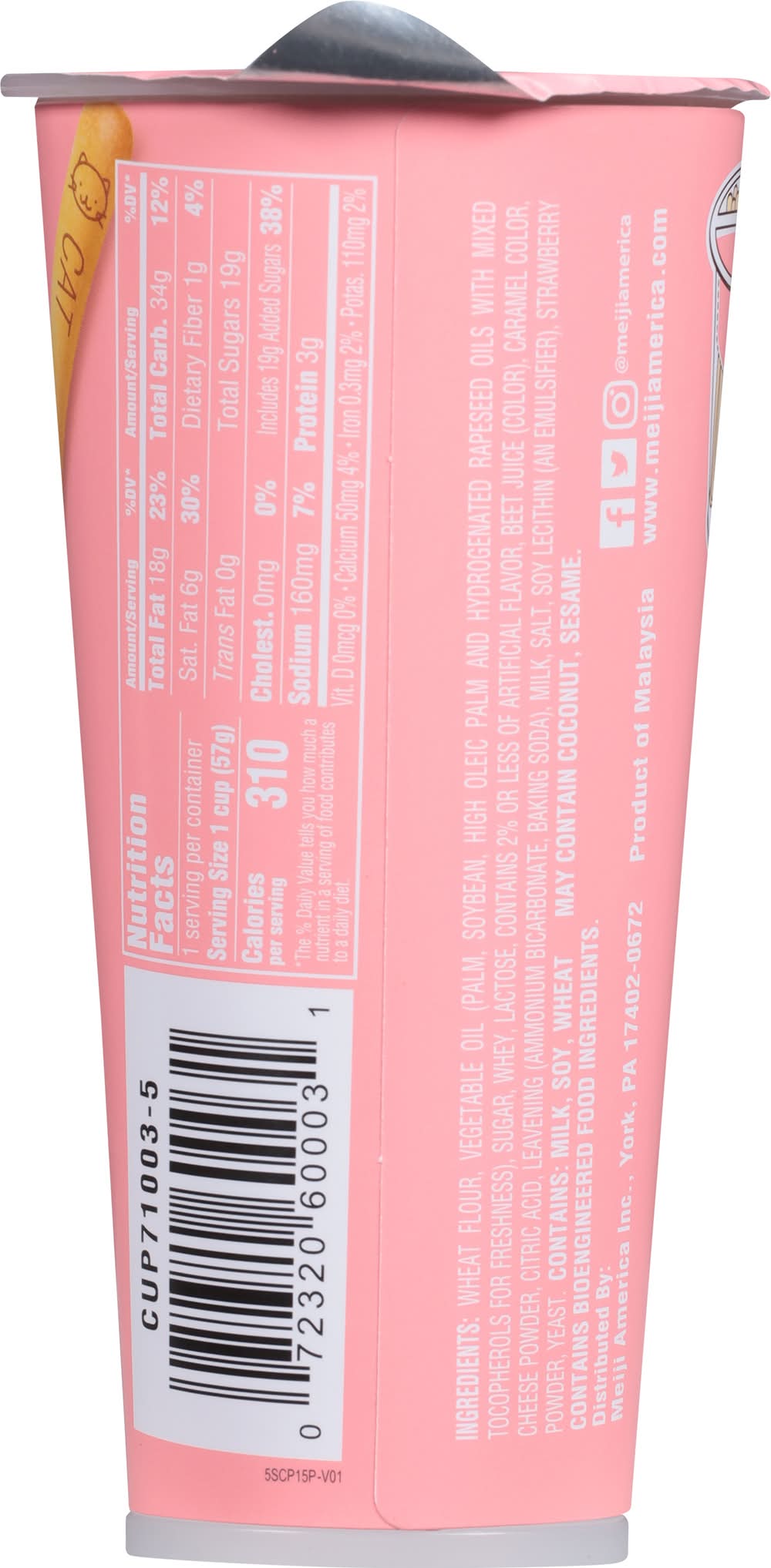 Strawberry creame with natural and artificial flavors. Contains bioengineered food ingredients. Duck. Mouse. Cat. Fun animal name games on each stick! Product of Malaysia. • Flavor: Strawberry • Meiji America Inc., York, PA 17402-0672 • Packaging: Reusable