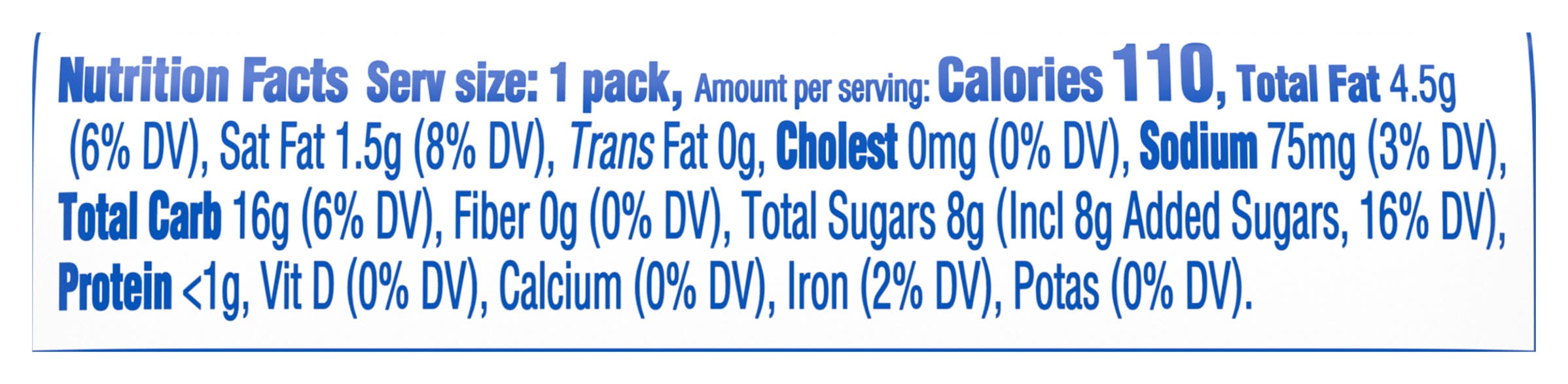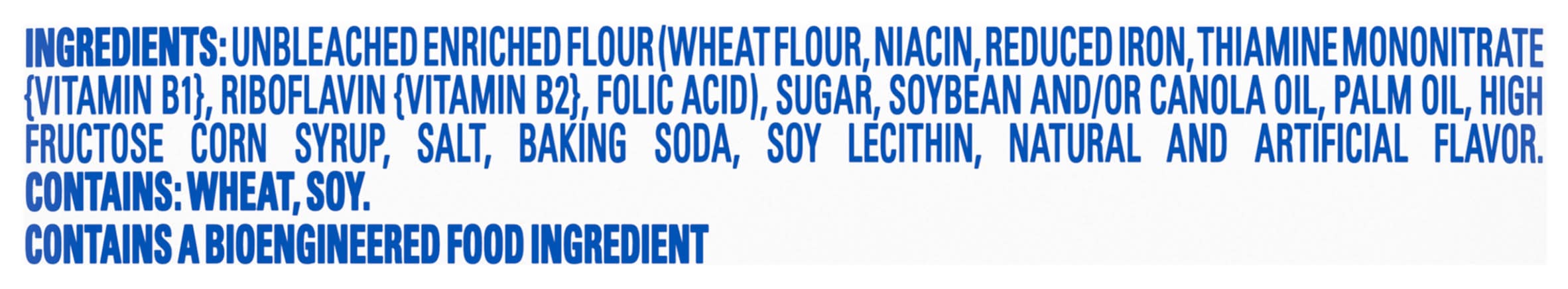 Ingredients: INGREDIENTS: UNBLEACHED ENRICHED FLOUR (WHEAT FLOUR, NIACIN, REDUCED IRON, THIAMINE MONONITRATE [VITAMIN B1], RIBOFLAVIN [VITAMIN B2], FOLIC ACID), SUGAR, SOYBEAN AND/OR CANOLA OIL, PALM OIL, HIGH FRUCTOSE CORN SYRUP, SALT, BAKING SODA, SOY LECITHIN, NATURAL AND ARTIFICIAL FLAVOR.CONTAINS: WHEAT, SOY. Contains: CONTAINS: WHEAT, SOY.