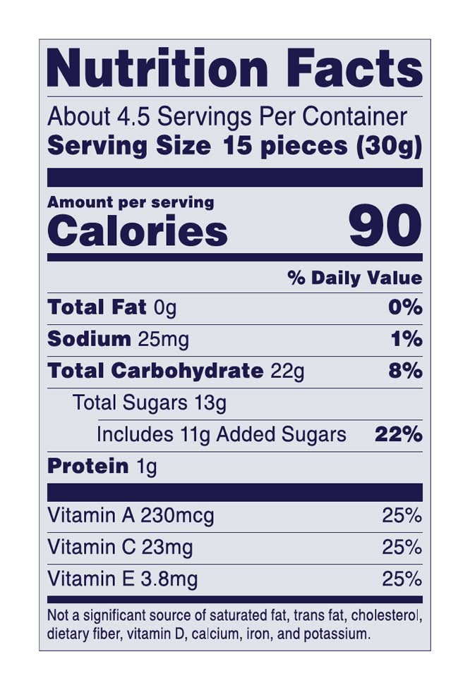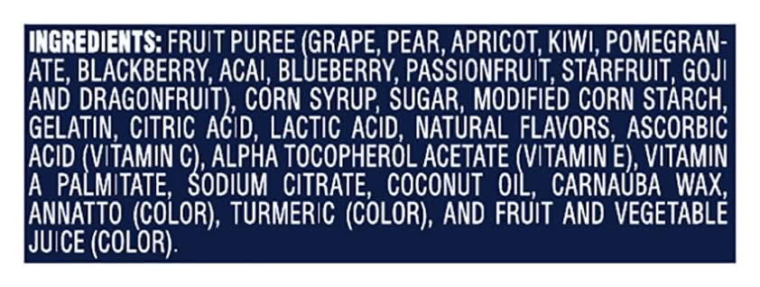 Ingredients: Fruit Puree (Grape, Pear, Apricot, Kiwi, Pomegranate, Blackberry, Acai, Blueberry, Passionfruit, Starfruit, Goji and Dragonfruit), Corn Syrup, Sugar, Modified Corn Starch, Gelatin, Citric Acid, Lactic Acid, Natural Flavors, Ascorbic Acid (Vitamin C), Alpha Tocopherol Acetate (Vitamin E), Vitamin A Palmitate, Sodium Citrate, Coconut Oil, Carnauba Wax, Annatto (Color), Turmeric (Color), and Fruit and Vegetable Juice (Color) Contains: Corn, Tree Nuts, Coconuts
