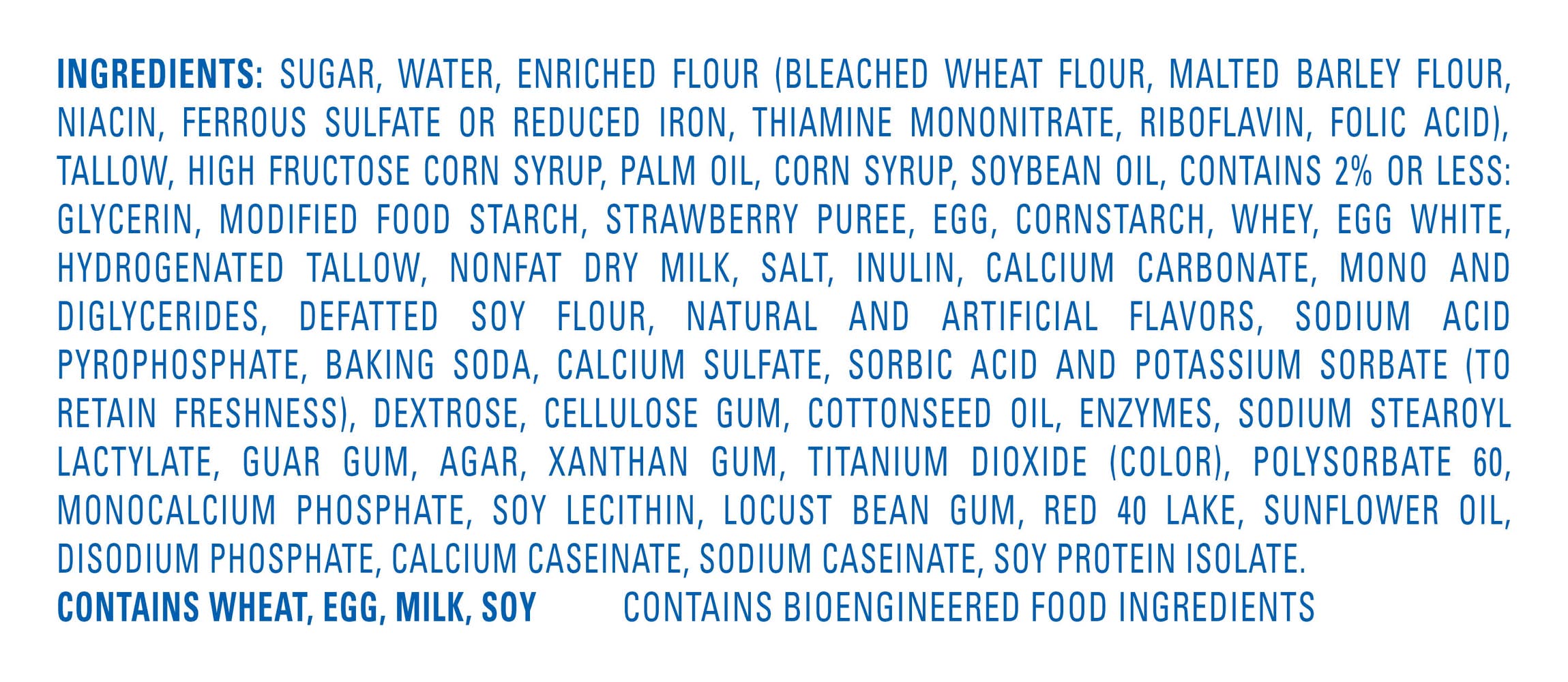 Ingredients: Sugar, Water, Enriched Flour (Bleached Wheat Flour, Malted Barley Flour, Niacin, Ferrous Sulfate Or Reduced Iron, Thiamine Mononitrate, Riboflavin, Folic Acid), Tallow, High Fructose Corn Syrup, Palm Oil, Corn Syrup, Contains 2% Or Less: Modified Food Starch, Cornstarch, Egg, Soybean Oil, Mono And Diglycerides, Whey, Palm Kernel Oil, Hydrogenated Tallow, Egg White, Nonfat Dry Milk, Inulin, Salt, Calcium Carbonate, Defatted Soy Flour, Calcium Sulfate, Sodium Acid Pyrophosphate, Baking Soda, Sorbic Acid And Potassium Sorbate (To Retain Freshness), Dextrose, Natural And Artificial Flavors, Cottonseed Oil, Glycerin, Agar, Polysorbate 60, Guar Gum, Cellulose Gum, Titanium Dioxide (Color), Soy Lecithin, Monocalcium Phosphate, Locust Bean Gum, Sunflower Lecithin, Dextrin, Red 40 Lake, Blue 1 Lake, Fumaric Acid, Disodium Phosphate, Sunflower Oil, Blue 2 Lake, Enzymes, Sodium Caseinate, Soy Protein Isolate, Calcium Caseinate, Confectioners Glaze, Yellow 5 Lake, Yellow 6 Lake, Red 3, Carnauba Wax, Blue 1, Yellow 5, Yellow 6. Contains Wheat, Egg, Milk, Soy Contains: Contains Wheat, Egg, Milk And Soy. Contains Bioengineered Food Ingredients