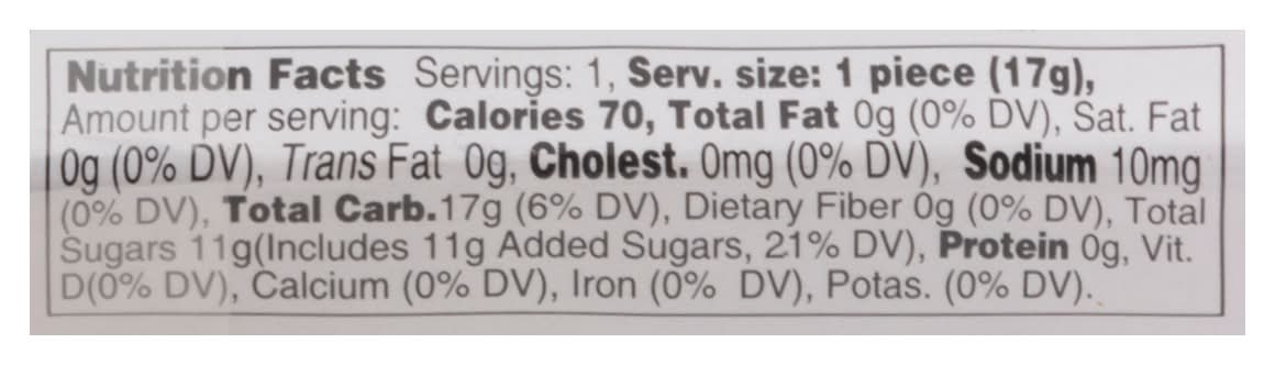 Ingredients: Sugar, High Maltose Syrup, Water, Buffered Lactic Acid, Artificial Flavor, Artificial Color (FD&C Blue No.1, Red No.40) Contains: Peanuts, Tree Nuts, Soybeans, Gluten