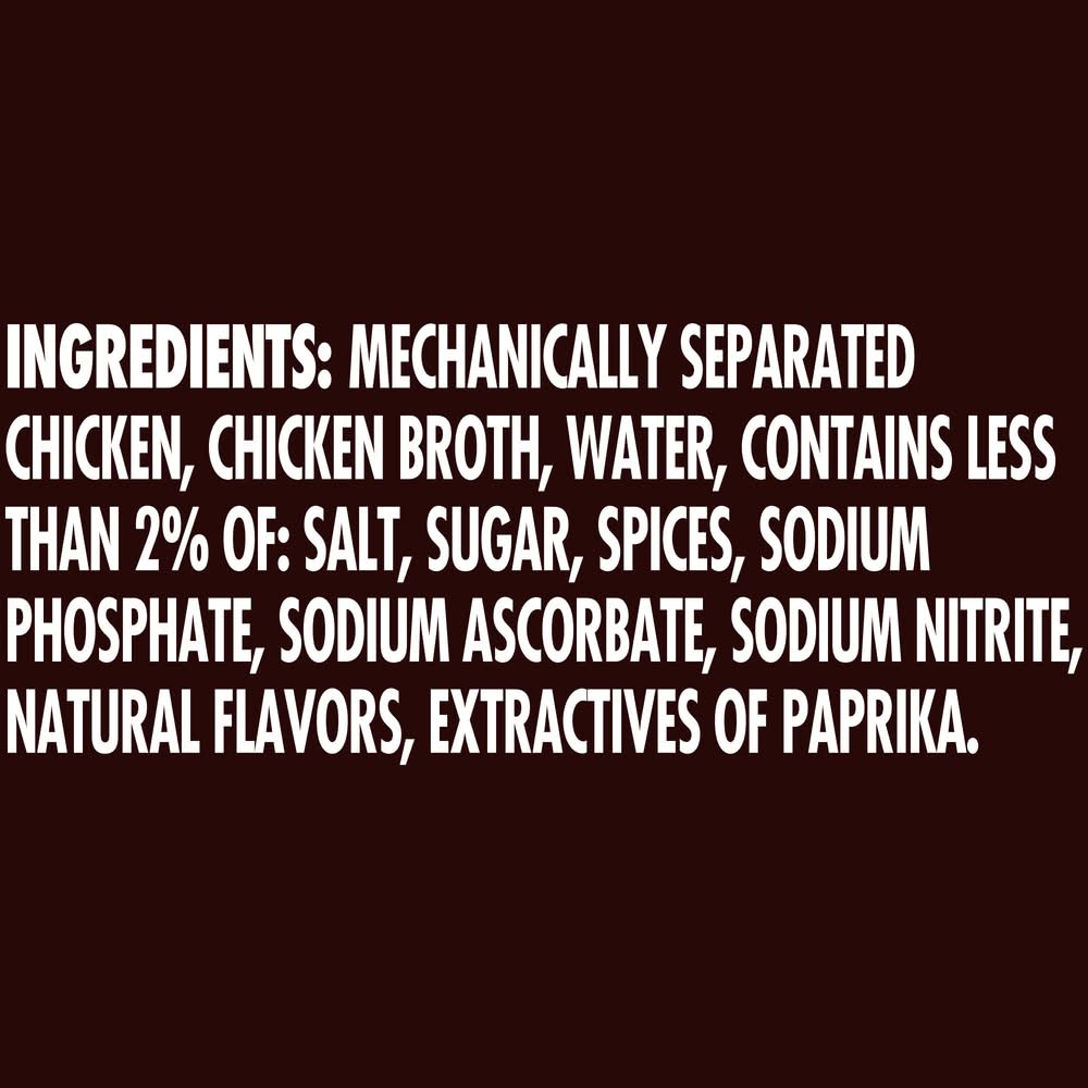Ingredients: Mechanically Separated Chicken, Chicken Broth, Water, Contains less than 2% of: Salt, Sugar, Spices, Sodium Phosphate, Sodium Ascorbate, Sodium Nitrite, Natural Flavors, Extractives of Paprika. Contains: Mustard (Canada and EU)