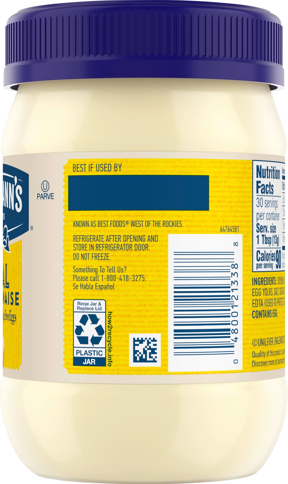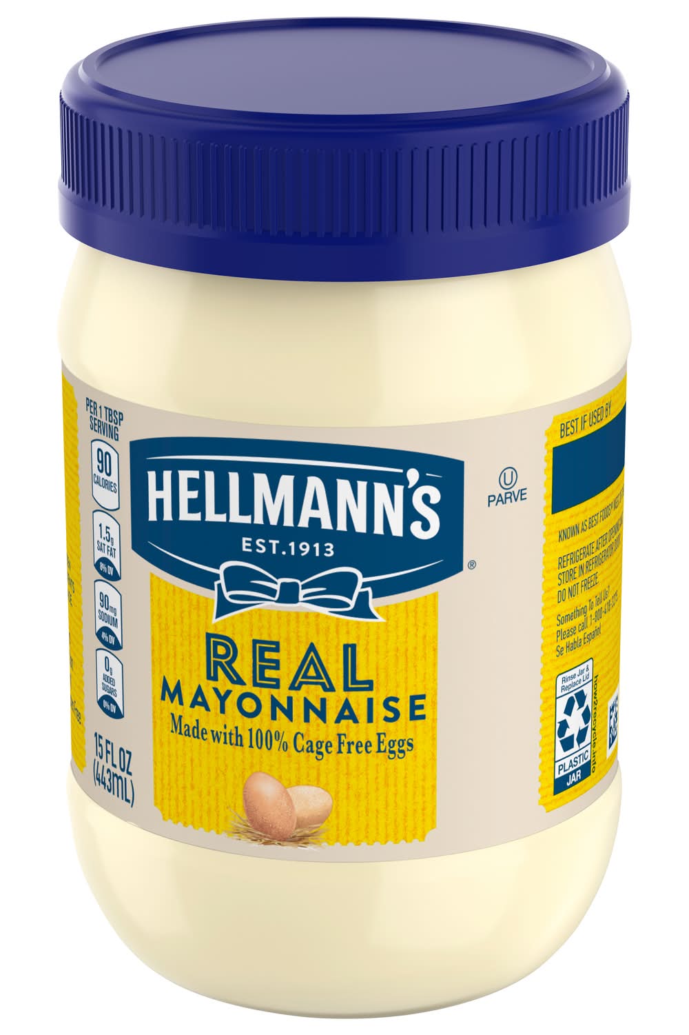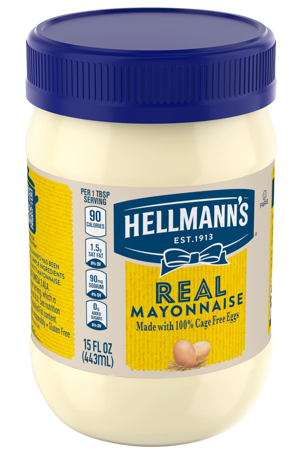 Hellmann's Real Mayonnaise is proudly made with real, simple ingredients like cage-free eggs, oil and vinegar. We know that to really "Bring Out The Best," we need to do more than just taste great. That’s why our delicious Blue Ribbon Quality Mayonnaise is made with real eggs, oil and vinegar sourced from trusted American farms. Even after 100 years, we’re still committed to using premium ingredients to craft the highest quality mayonnaise. It's simple. We use the finest, real ingredients in Hellmann's Real. In fact, we use 100% cage-free eggs and are committed to 100% responsibly sourced soybean oil. Our authentic mayonnaise is rich in Omega 3-ALA (contains 650mg ALA per serving, which is 40% of the 1.6g Daily Value for ALA), and is also gluten free and certified kosher. And nothing beats the taste of real mayo. It’s the ideal sandwich spread or condiment for grilling juicy burgers, mixing creamy dips, and preparing fresh salads. Use it to make outrageously delicious meals like our Parmesan Crusted Chicken and Best Ever Juicy Burger, and even turn your Thanksgiving leftovers into a deliciously creamy meal with our Turkey Casserole. Packaging: Reusable