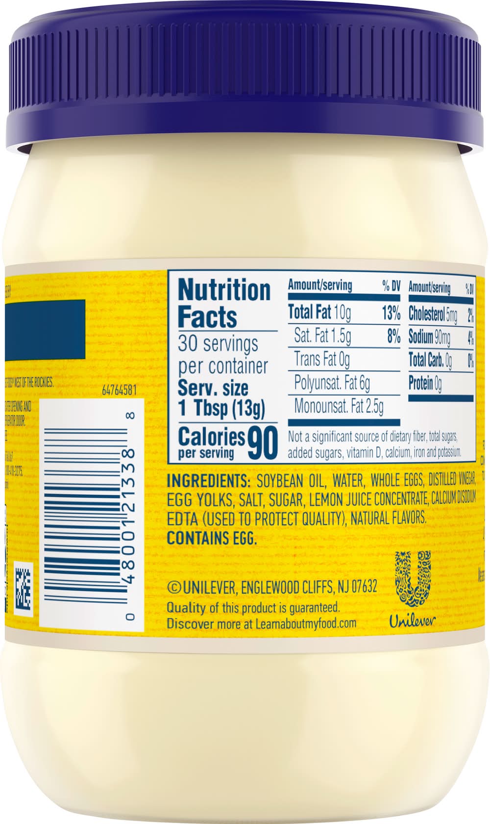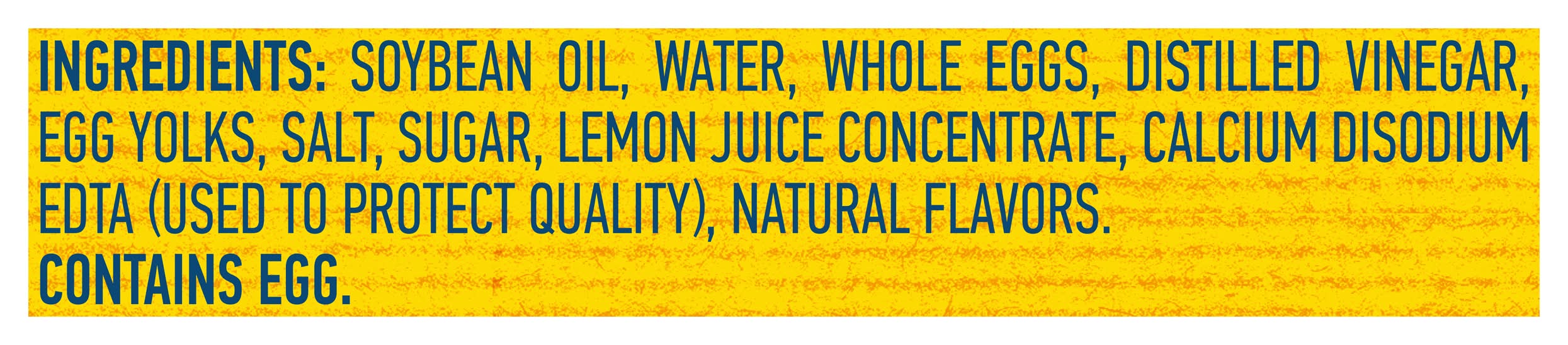 Ingredients: Soybean Oil, Water, Whole Eggs, Distilled Vinegar, Egg Yolks, Salt, Sugar, Lemon Juice Concentrate, Calcium Disodium EDTA (Used to Protect Quality), Natural Flavors Contains: Eggs, Soybeans