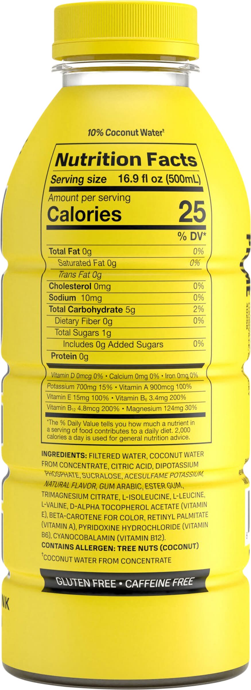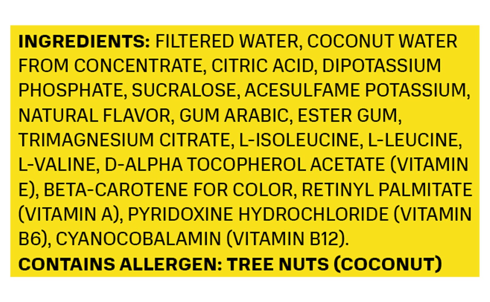 Ingredients: Filtered Water, Coconut Water From Concentrate, Citric Acid, Dipotassium Phosphate, Sucralose, Acesulfame Potassium, Natural Flavor, Gum Arabic, Ester Gum, Trimagnesium Citrate, L-Isoleucine, L-Leucine, L-Valine, D-Alpha Tocopherol Acetate (Vitamin E), Beta-Carotene for Color, Retinyl Palmitate (Vitamin A), Pyridoxine Hydrochloride (Vitamin B6), Cyanocobalamin (Vitamin B12) Contains: Tree Nuts, Coconuts