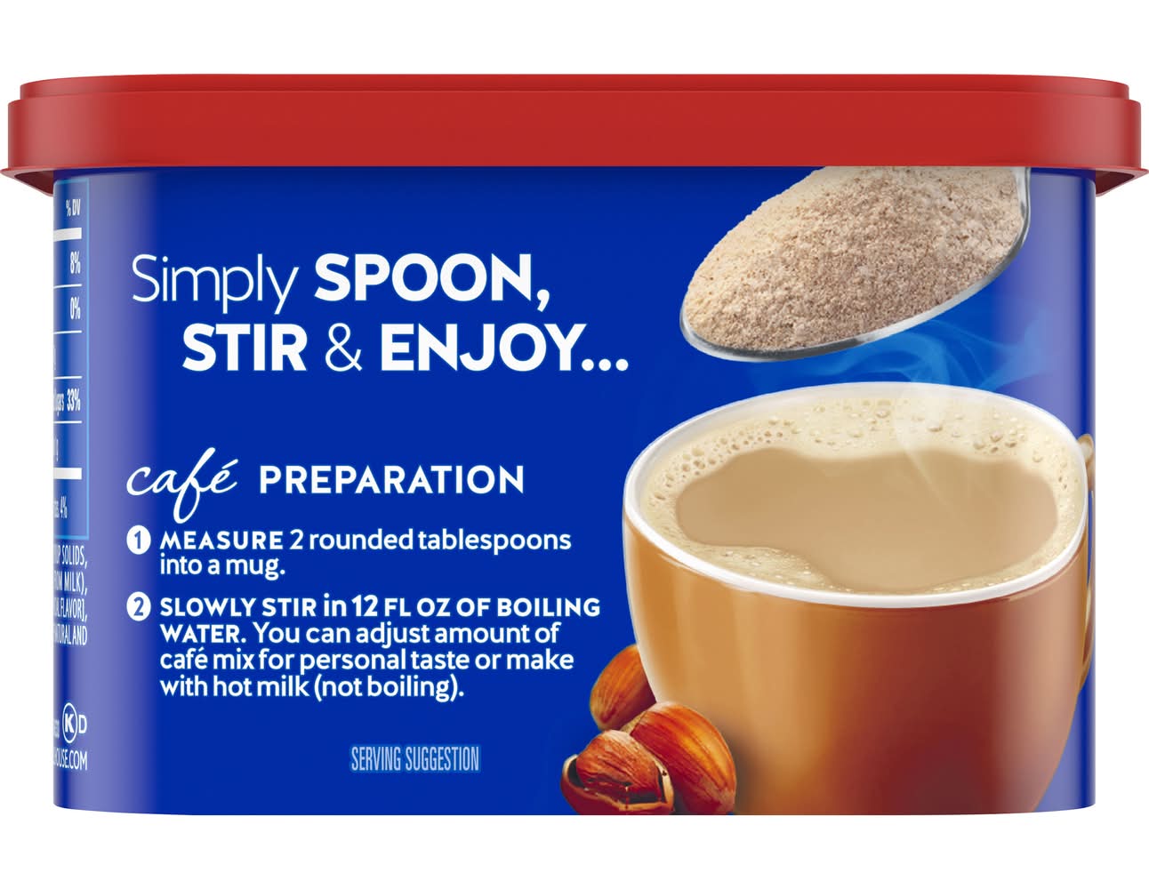 Reconstitute: café preparation 1. measure 2 rounded tablespoons into a mug. 2. slowly stir in 12 fl. oz. of boiling water. you can adjust amount of café mix for personal taste or make with hot milk (not boiling). best when used by date on bottom.