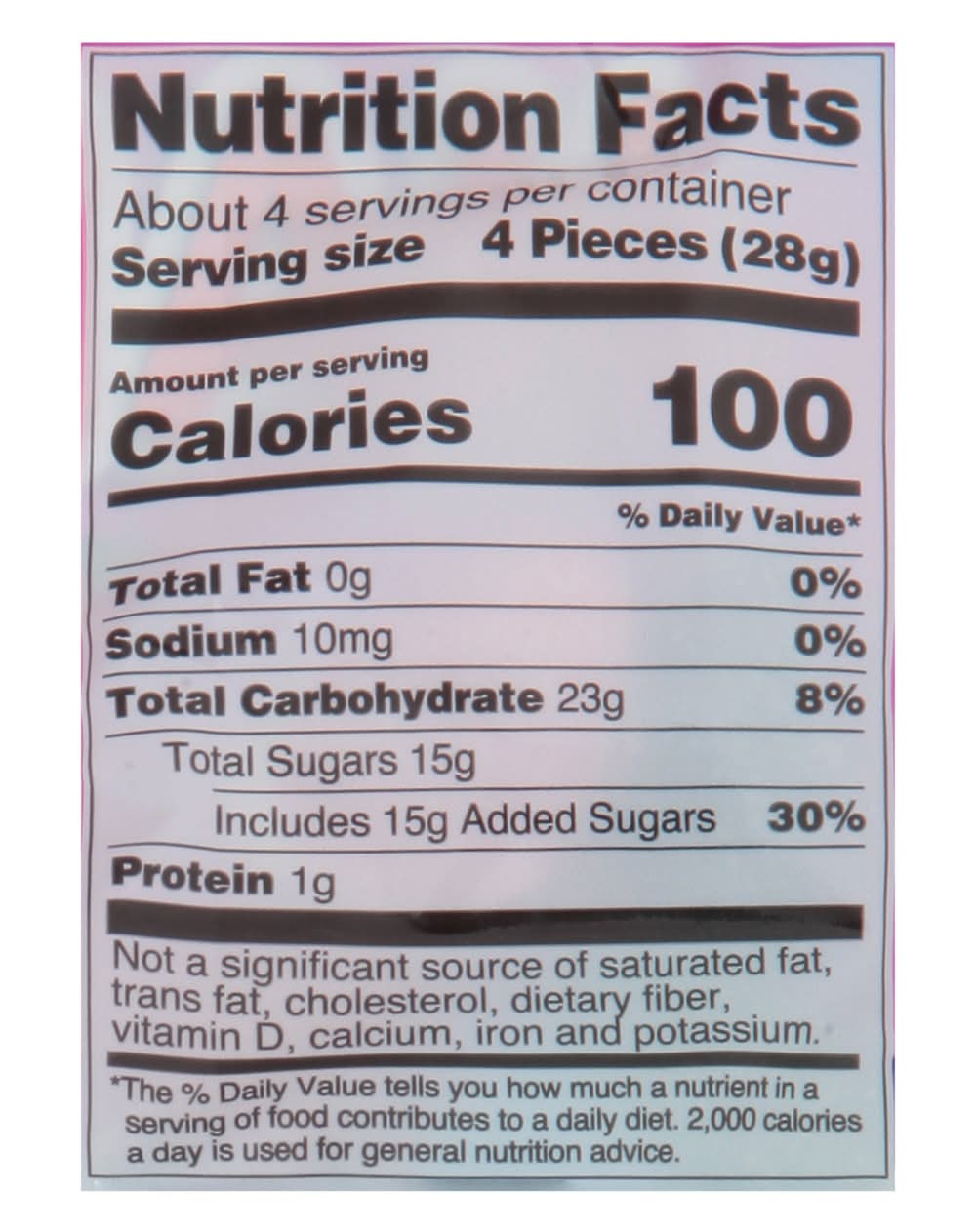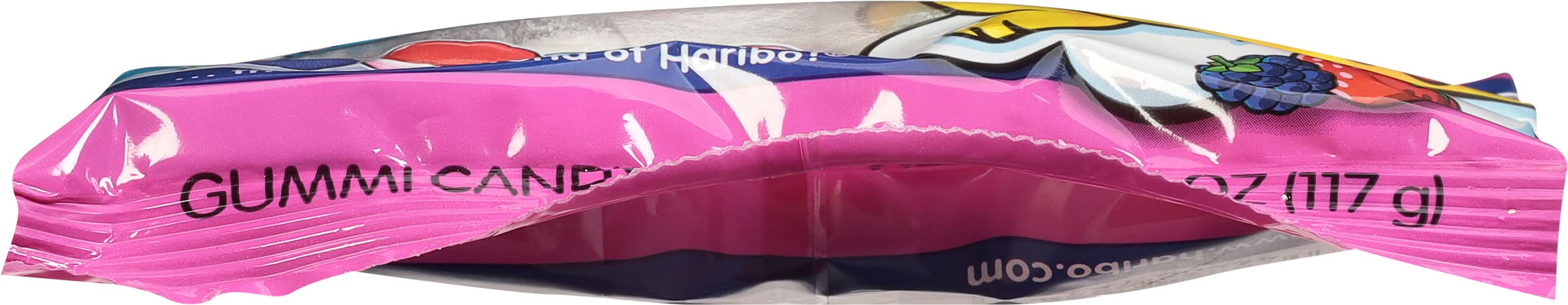 It features a trio of berry flavors: blueberry, wildberry, and strawberry. These gummies are artificially flavored, offering a soft and fruity texture. Each serving is approximately four pieces. The candy is produced in Germany and is presented in a share size, making it suitable for enjoyment by both children and adults. • Flavor: Assorted • Haribo of America, Inc., Rosemont, IL 60018