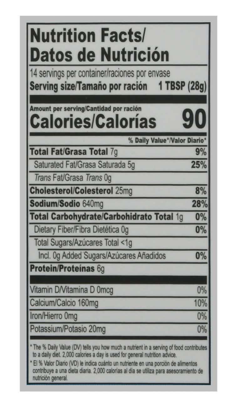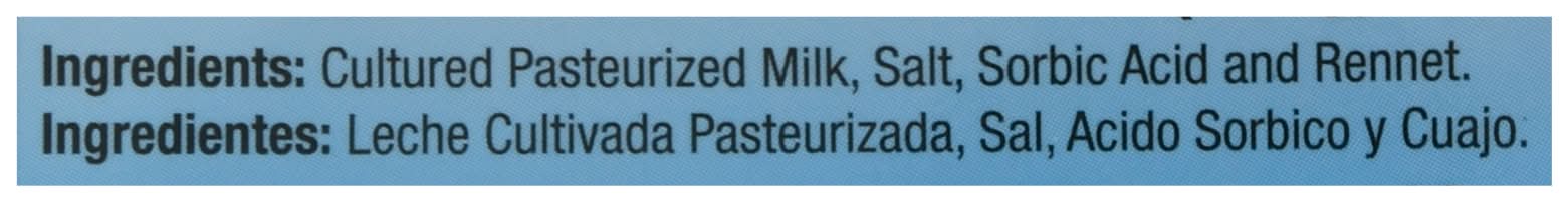 Ingredients: Cultured Pasteurized Milk, Salt, Sorbic Acid and Rennet. Contains: Milk