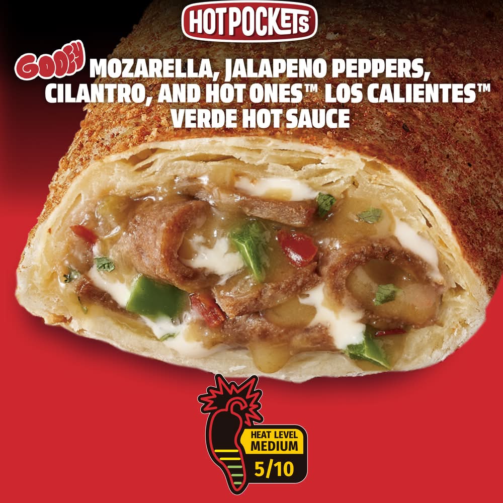 Dive into the spicy, cheesy, saucy and savory world of snacking with Hot Pockets Hot Ones Smokey Green Chili Cheesesteak Frozen Snacks. Inspired by Cali-Mex flavors, Hot Ones Los Calientes Verde surfs over the palate with medium heat and a smoky blend of chiles, sweet fruit, and tart tomatillo. Tender steak and melty cheddar cheese inside a deliciously crispy buttery crust turn this into the ultimate Hot Ones spicy cheesesteak experience. These frozen appetizers aren’t like your average microwavable food or frozen snack. Hot Pockets Hot Ones Smokey Green Chili Cheesesteak frozen sandwiches are hunger’s worst nightmare, delivering the bold flavors of a steak and cheese sandwich in a hearty snack. Whether you’re looking for a quick lunch or easy dinner, each steak and cheese Hot Pocket is a perfect snack for any occasion. Each frozen sandwich is a good source of protein with 8 grams of protein per sandwich. This microwave food is a snap to prepare as a tasty on the go snack. If you have more time, bake these frozen lunch snacks in the oven or toss one in the air fryer. No matter how you prepare them, Hot Pockets frozen sandwiches are hot and delicious every time. Keep Hot Pockets Steak and Cheese microwave meals in the freezer until you're ready to eat. Try Hot Pockets Breakfast, Big & Bold and Deliwich frozen snack products to amp up your snacktime with titanic flavor. • Nestle USA, Inc., Solo OH, 44139 • Packaging: Reusable