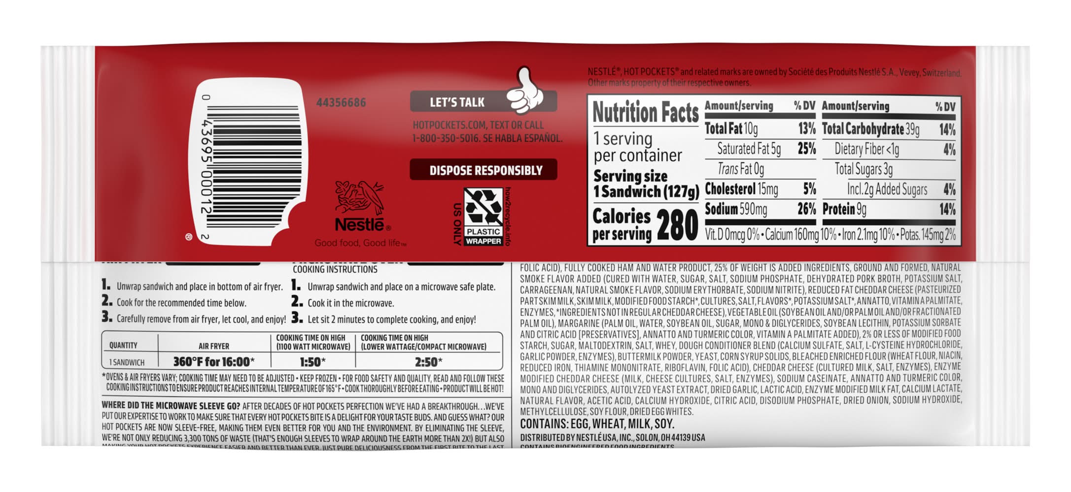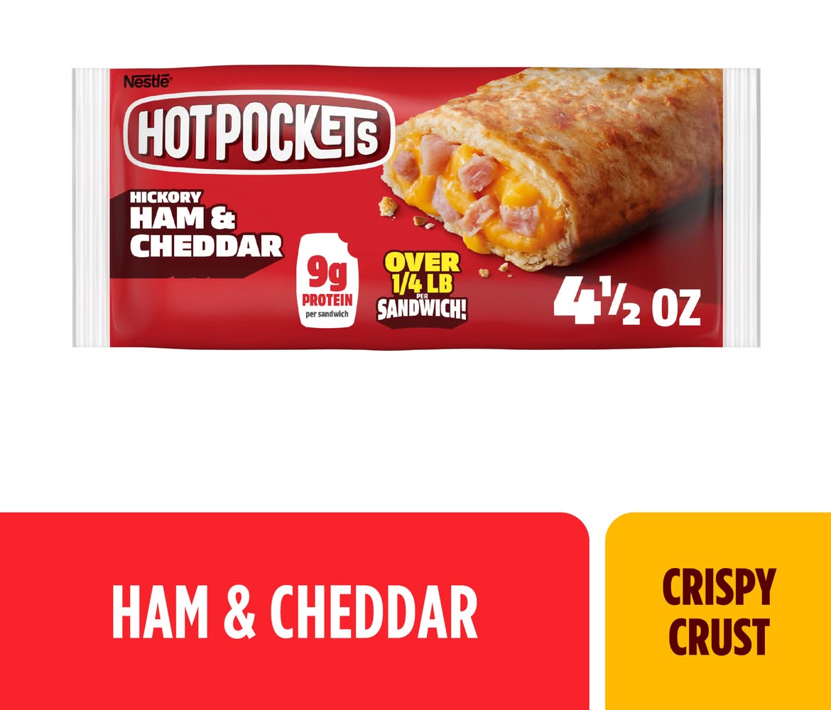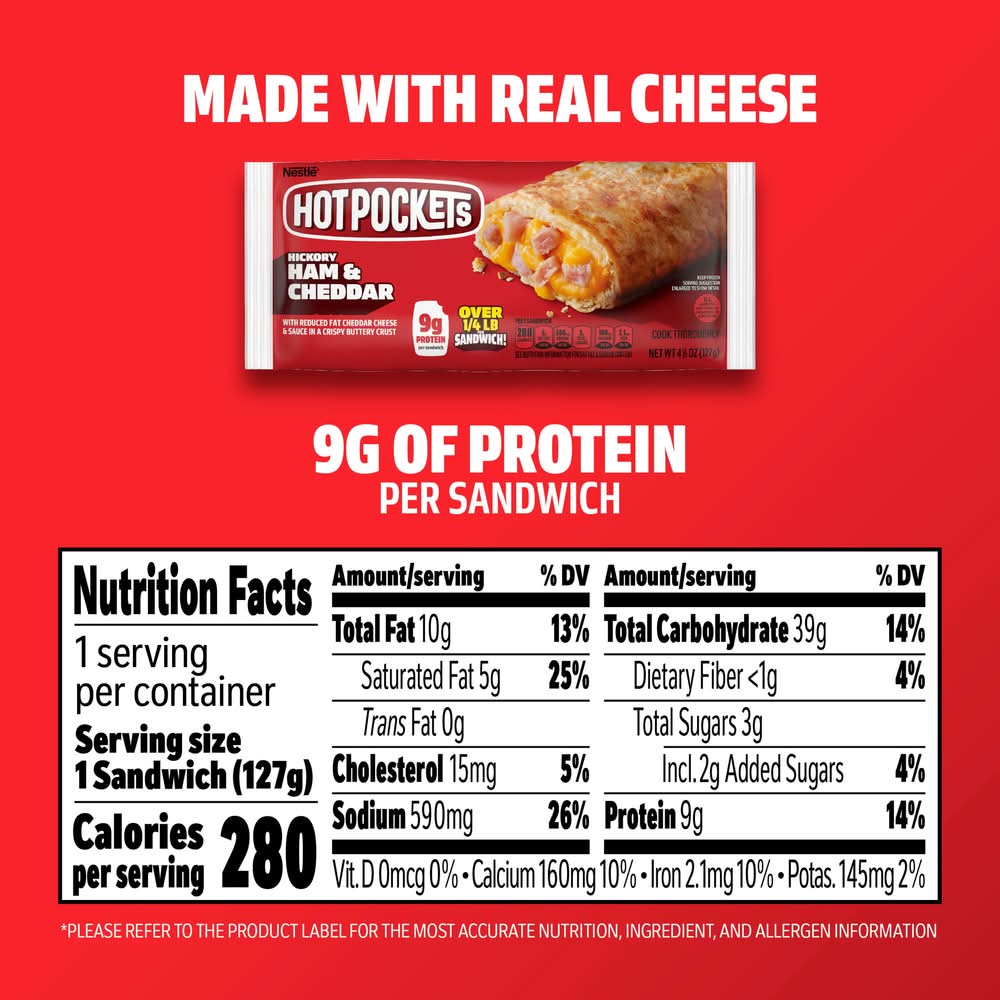 Dive into the cheesy, saucy and savory world of snacking with Hot Pockets frozen snacks. Our frozen sandwiches are loaded with hickory ham along with reduced fat cheddar cheese inside a deliciously crispy, buttery crust. These indulgent Hot Pockets are not your average frozen lunch snacks. Hot Pockets sandwiches are hunger’s worst nightmare, delivering the bold flavors of ham and cheddar cheese in a hearty microwaveable snack. Great for gaming all night, a quick snack after school or a quick bite before heading out the door -- ham and cheese Hot Pockets are perfect for any occasion. Each frozen sandwich is a good source of protein with 9 grams per sandwich. Cook this microwave food for 1 minute, 50 seconds on high and let cool for 2 minutes for an on-the-go snack. Air fry at 360 degrees Fahrenheit for 16 minutes. Hot Pockets sandwiches are hot and delicious every time. Keep these ham and cheese Hot Pockets sandwiches frozen until ready to cook and eat.
