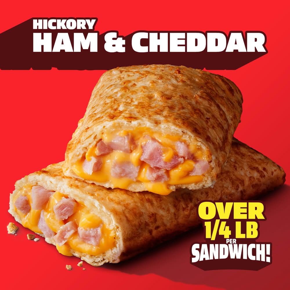 Ingredients: WATER, ENRICHED FLOUR (WHEAT FLOUR, MALTED BARLEY FLOUR, NIACIN, IRON, THIAMINE MONONITRATE, RIBOFLAVIN, FOLIC ACID), FULLY COOKED HAM AND WATER PRODUCT, 25% OF WEIGHT IS ADDED INGREDIENTS, GROUND AND FORMED, NATURAL SMOKE FLAVOR ADDED (CURED WITH WATER, SUGAR, SALT, SODIUM PHOSPHATE, DEHYDRATED PORK BROTH, POTASSIUM SALT, CARRAGEENAN, NATURAL SMOKE FLAVOR, SODIUM ERYTHORBATE, SODIUM NITRITE), REDUCED FAT CHEDDAR CHEESE (PASTEURIZED PART SKIM MILK, SKIM MILK, MODIFIED FOOD STARCH*, CULTURES, SALT, FLAVORS*, POTASSIUM SALT*, ANNATTO, VITAMIN A PALMITATE, ENZYMES, *INGREDIENTS NOT IN REGULAR CHEDDAR CHEESE), VEGETABLE OIL (SOYBEAN OIL AND/OR PALM OIL AND/OR FRACTIONATED PALM OIL), MARGARINE (PALM OIL, WATER, SOYBEAN OIL, SUGAR, MONO DIGLYCERIDES, SOYBEAN LECITHIN, POTASSIUM SORBATE AND CITRIC ACID [PRESERVATIVES], ANNATTO AND TURMERIC COLOR, VITAMIN A PALMITATE ADDED), 2% OR LESS OF MODIFIED FOOD STARCH, SUGAR, MALTODEXTRIN, SALT, WHEY, DOUGH CONDITIONER BLEND (CALCIUM SULFATE, SALT, L-CYSTEINE HYDROCHLORIDE, GARLIC POWDER, ENZYMES), BUTTERMILK POWDER, YEAST, CORN SYRUP SOLIDS, BLEACHED ENRICHED FLOUR (WHEAT FLOUR, NIACIN, REDUCED IRON, THIAMINE MONONITRATE, RIBOFLAVIN, FOLIC ACID), CHEDDAR CHEESE (CULTURED MILK, SALT, ENZYMES), ENZYME MODIFIED CHEDDAR CHEESE (MILK, CHEESE CULTURES, SALT, ENZYMES), SODIUM CASEINATE, ANNATTO AND TURMERIC COLOR, MONO AND DIGLYCERIDES, AUTOLYZED YEAST EXTRACT, DRIED GARLIC, LACTIC ACID, ENZYME MODIFIED MILK FAT, CALCIUM LACTATE, NATURAL FLAVOR, ACETIC ACID, CALCIUM HYDROXIDE, CITRIC ACID, DISODIUM PHOSPHATE, DRIED ONION, SODIUM HYDROXIDE, METHYLCELLULOSE, SOY FLOUR, DRIED EGG WHITES. Contains: CONTAINS: EGG, WHEAT, MILK, SOY.