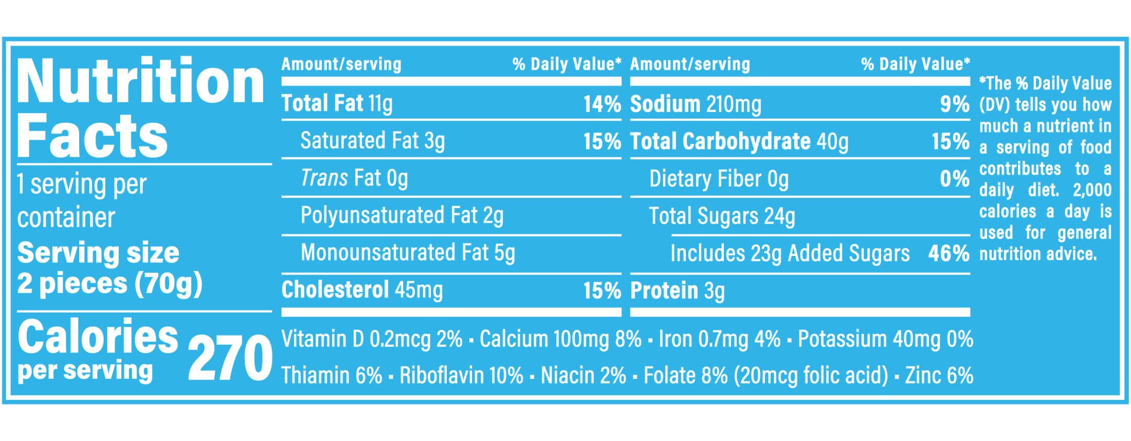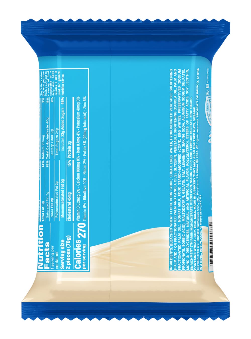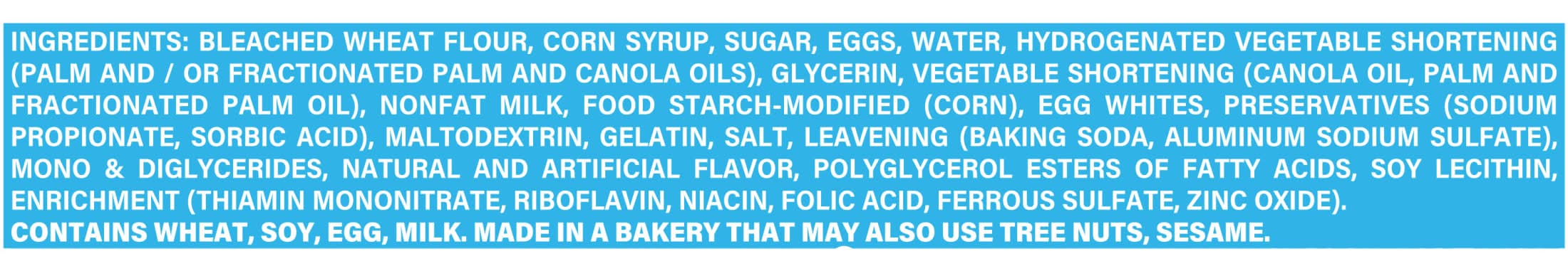Ingredients: BLEACHED WHEAT FLOUR, CORN SYRUP, SUGAR, EGGS, WATER, HYDROGENATED VEGETABLE SHORTENING (PALM AND/OR FRACTIONATED PALM AND CANOLA OILS), GLYCERIN, VEGETABLE SHORTENING [CANOLA OIL, PALM AND FRACTIONATED PALM OIL], NONFAT MILK, FOOD STARCH-MODIFIED (CORN), EGG WHITES, PRESERVATIVES [SODIUM PROPIONATE, SORBIC ACID], MALTODEXTRIN, GELATIN, SALT, LEAVENING [BAKING SODA, ALUMINUM SODIUM SULFATE], MONO DIGLYCERIDES, NATURAL ARTIFICIAL FLAVOR, POLYGLYCEROL ESTERS OF FATTY ACIDS, SOY LECITHIN, ENRICHMENT [THIAMIN MONONITRATE, RIBOFLAVIN, NIACIN, FOLIC ACID, FERROUS SULFATE, ZINC OXIDE], . Contains: CONTAINS EGG, MILK, SOY, WHEAT.