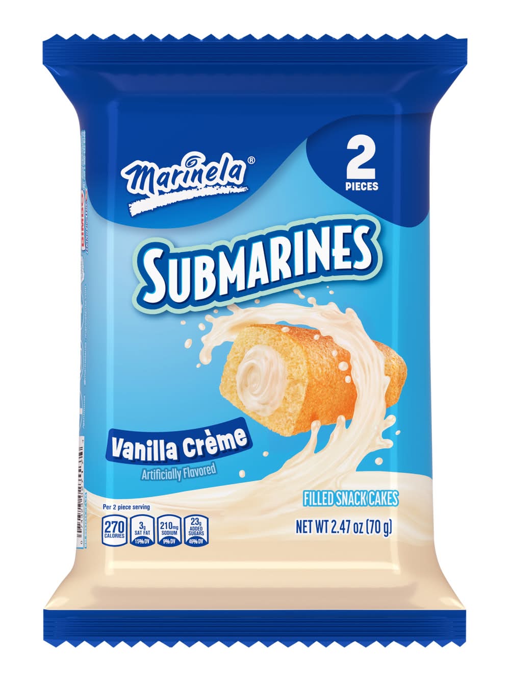 Are you in the mood for something delicious? Submarinos snack cakes will satisfy your craving. Enjoy the delectable taste of a delicious artificially flavored snack-sized fluffy caked filled with vanilla flavored crème for a taste you won’t forget. No need to go to the bakery; Submarinos snack cakes are individually wrapped for freshness, every time. They are a great snack for kids to enjoy with a glass of ice-cold milk while sharing with friends, or as a special treat after their soccer game. Adults love Submarinos snack cakes with their afternoon coffee or as an indulgent little dessert. Marinela stands for fun! Our products include favorites like crème-filled chocolate cupcakes, butter cookies, and unique varieties like orange and raisin cakes to satisfy your sweet tooth. Take one bite of any of our cookies, snack cakes, or pies, and you’ll get a taste of how cool it is to go back to your childhood again! Marinela Is in Me. Marinela Is in You. Flavor: Vanilla