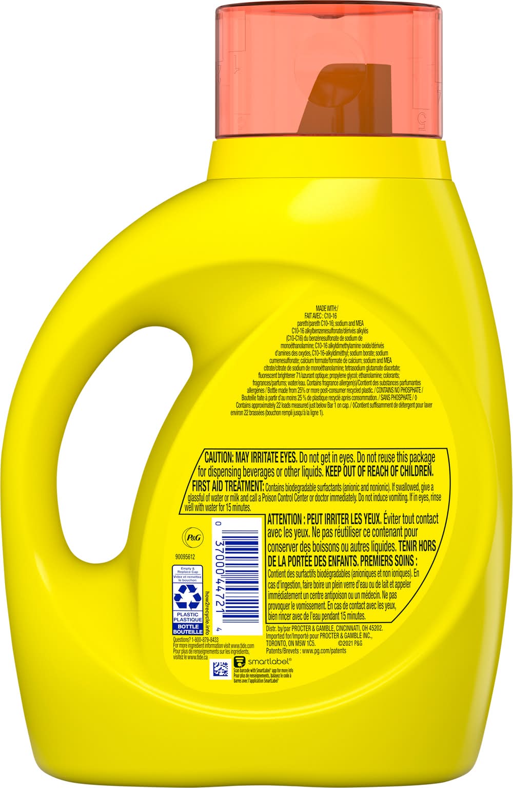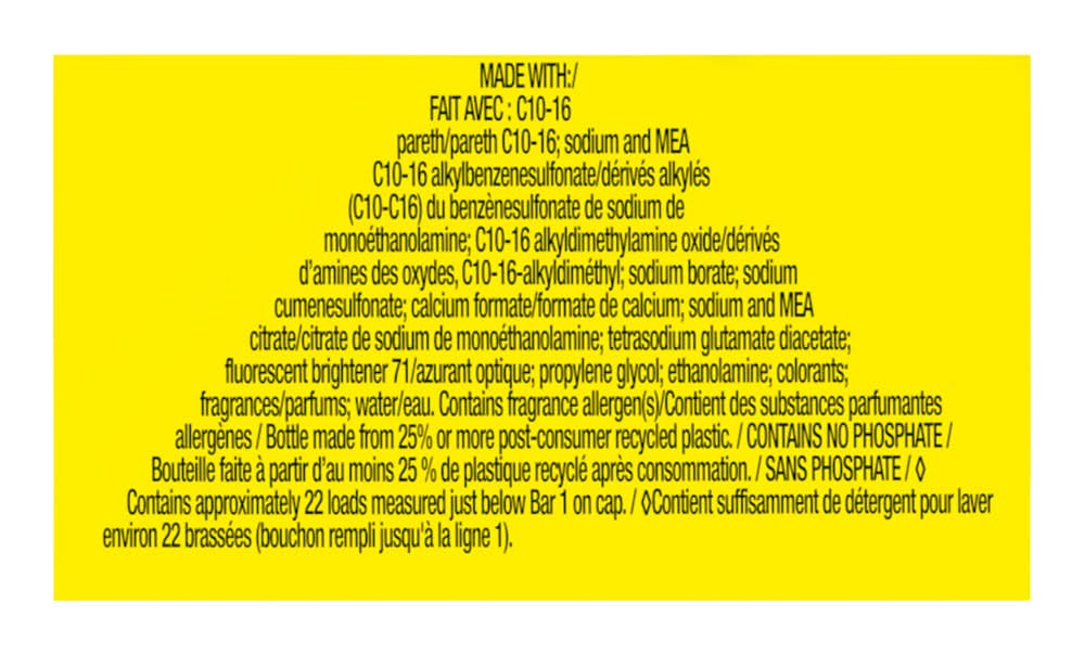 Ingredients: Made with: C10-16 Pareth/Pareth C10-16; Sodium and MEA C10-16 Alkylbenzenesulfonate/Derives Alkyles (C10-C16), Du Benzenesulfonate De Sodium De Monoethanolamine; C10-16 Alkyldimethylamine Oxide/Derives D'amines Des Oxydes, C10-16-Alkyldimethyl; Sodium Borate; Sodium Cumenesulfonate; Calcium Formate/Formate De Calcium;, Sodium and MEA Citrate/Citrate De Sodium De Monoethanolamine; Tetrasodium Glutamate Diacetate; Fluorescent Brightener 71/Azurant Optique; Propylene Glycol; Ethanolamine; Colorants; Fragrances/Parfums; Water/Eau.